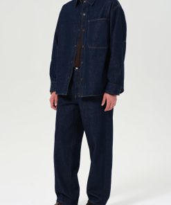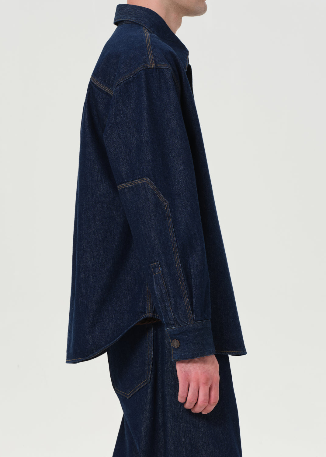 A long-sleeve button-up cut from rigid, heavyweight denim in a clean dark rinse. Crafted from 100% Regenerative Cotton with a soft, wearable hand. Structured, minimal, and true to size.