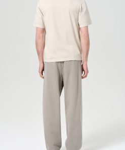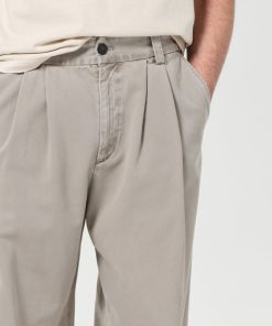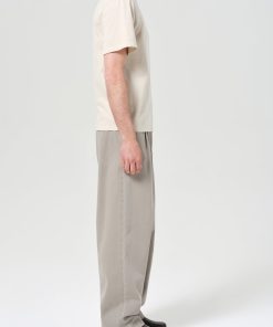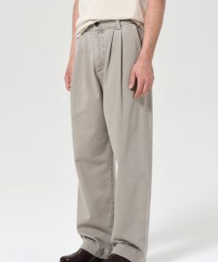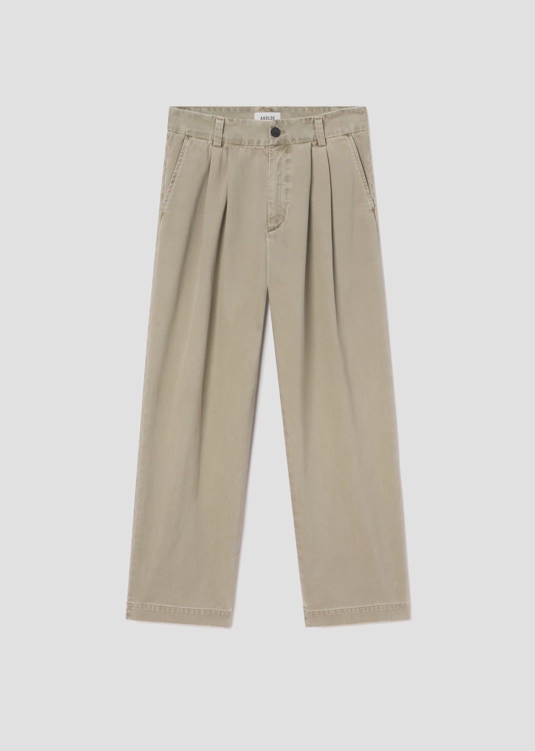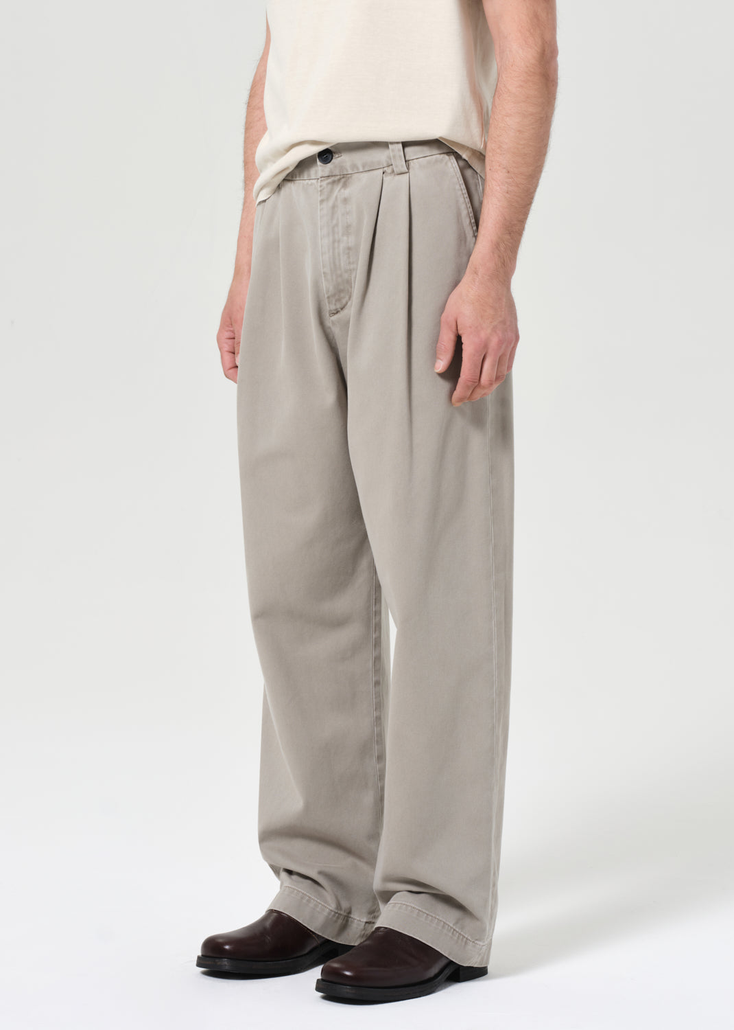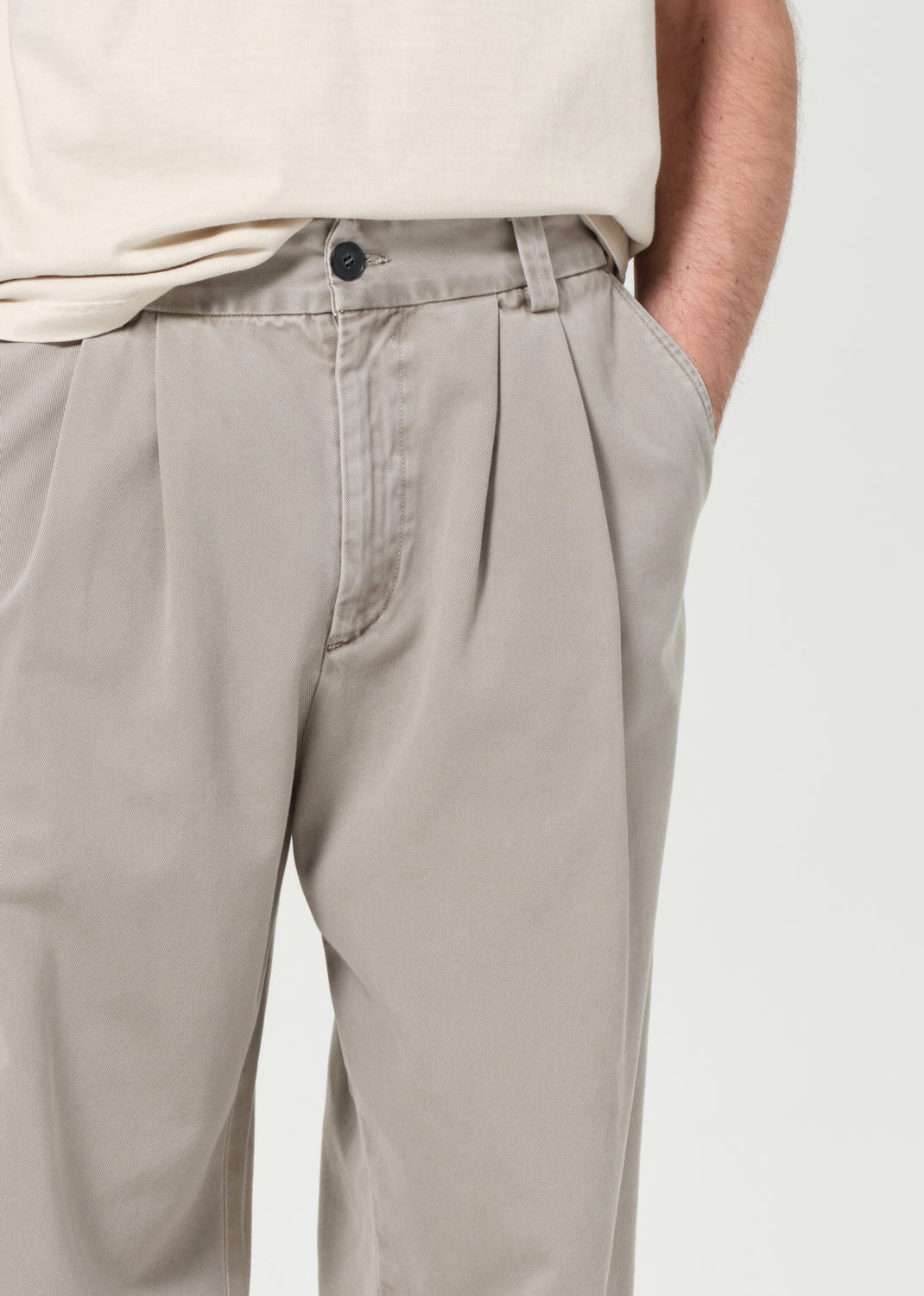 A washed-out grey trouser with front pleat detailing. True to size with a relaxed, tailored fit.