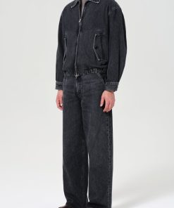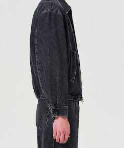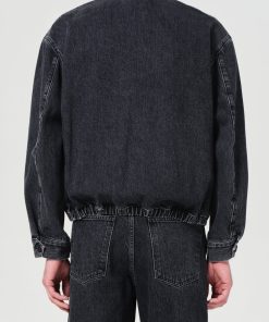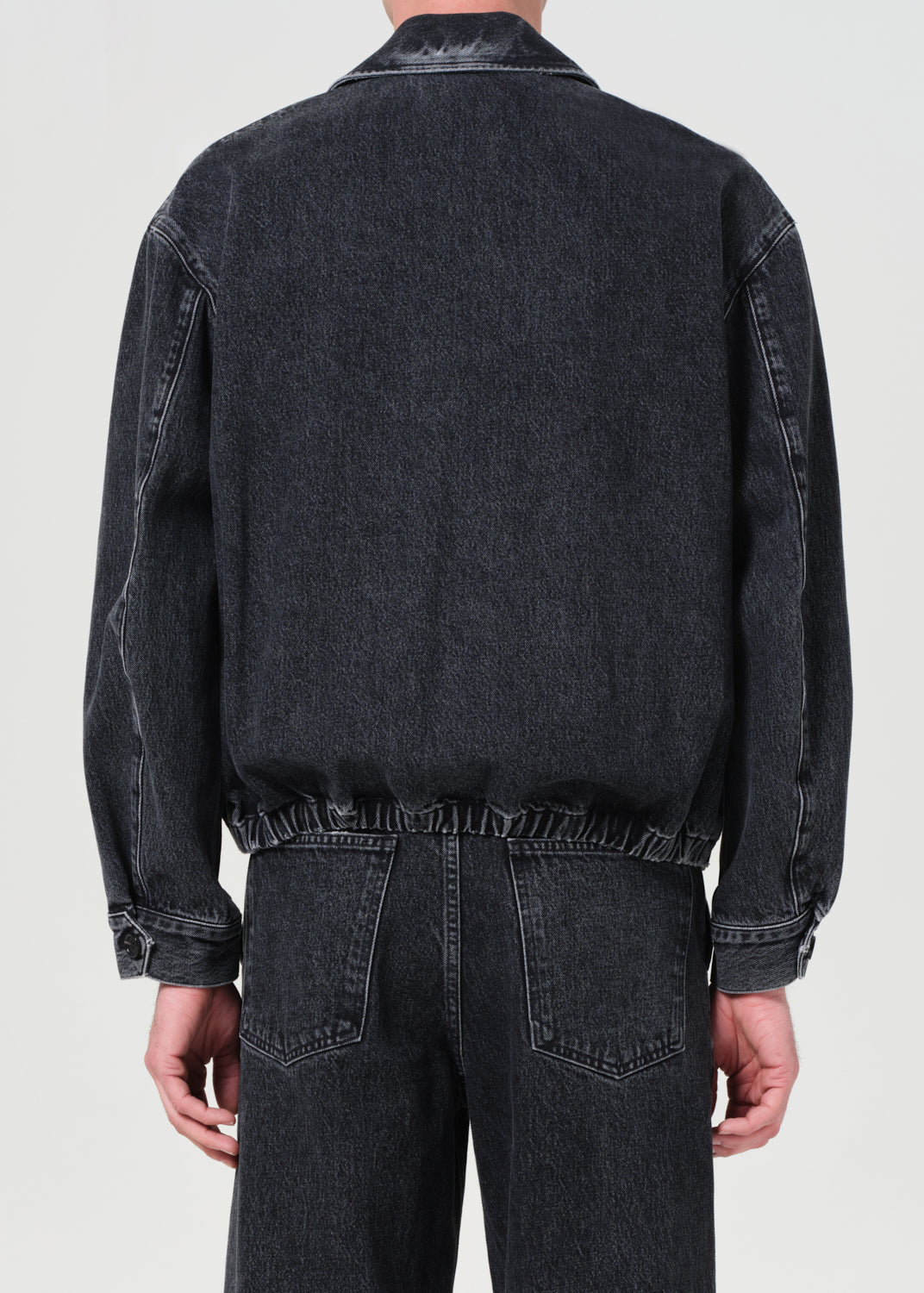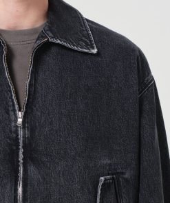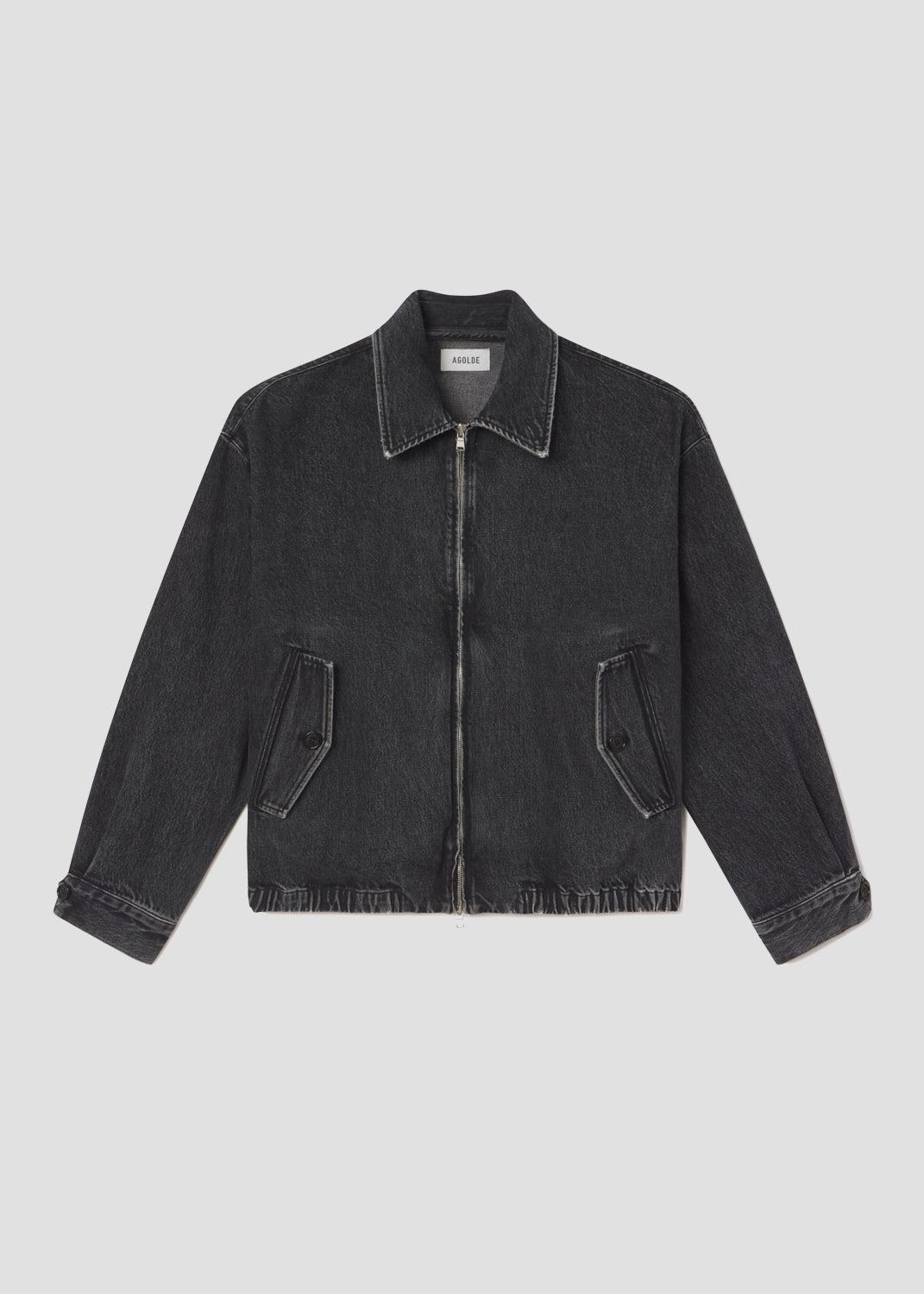 Worn-in washed black denim with a pointed collar and zipper front closure.