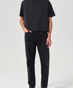 Worn-in washed black denim with a pointed collar and zipper front closure.