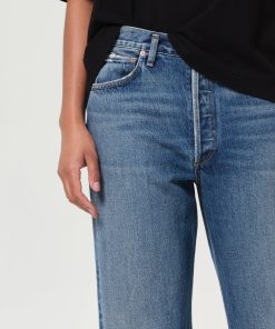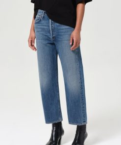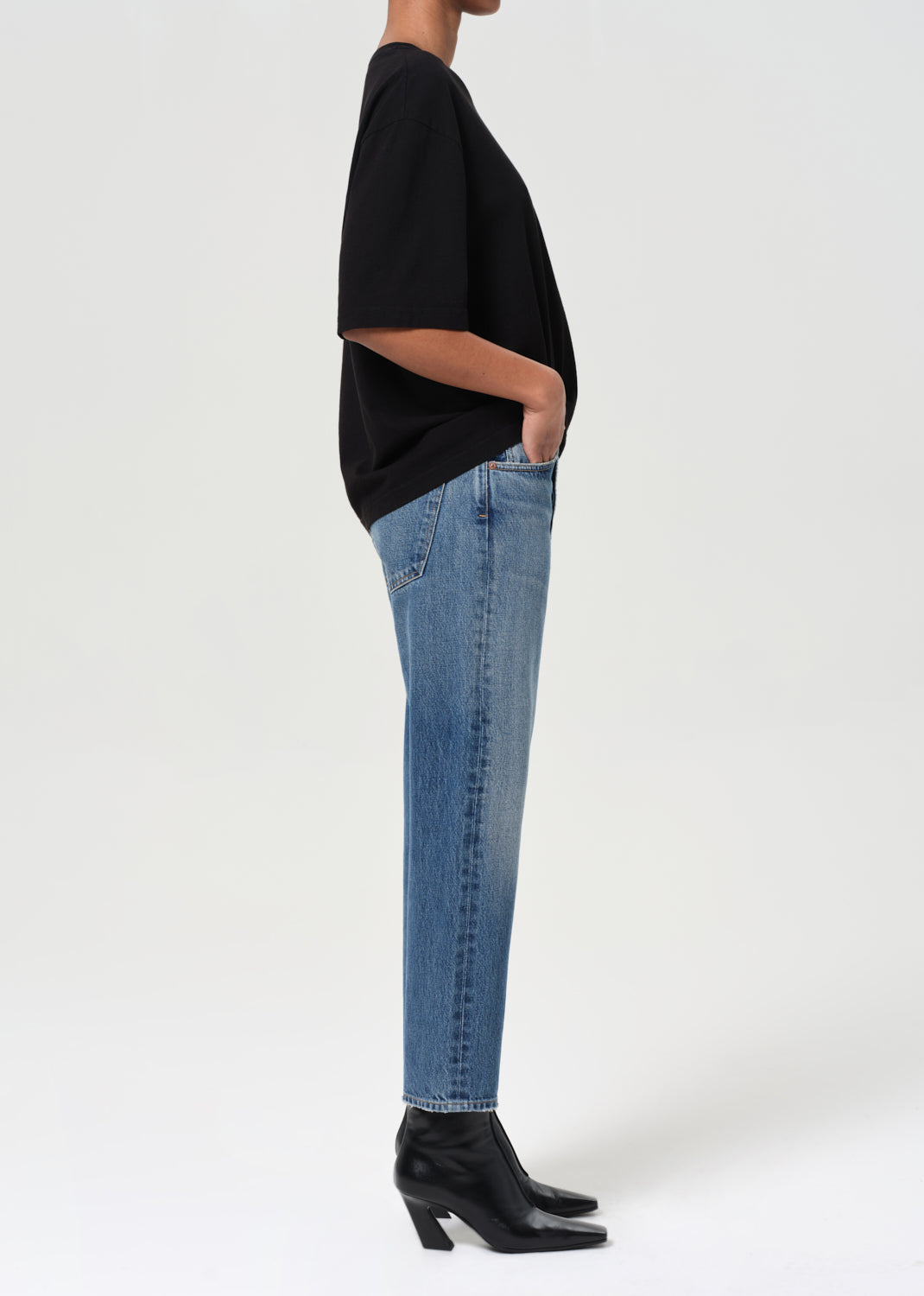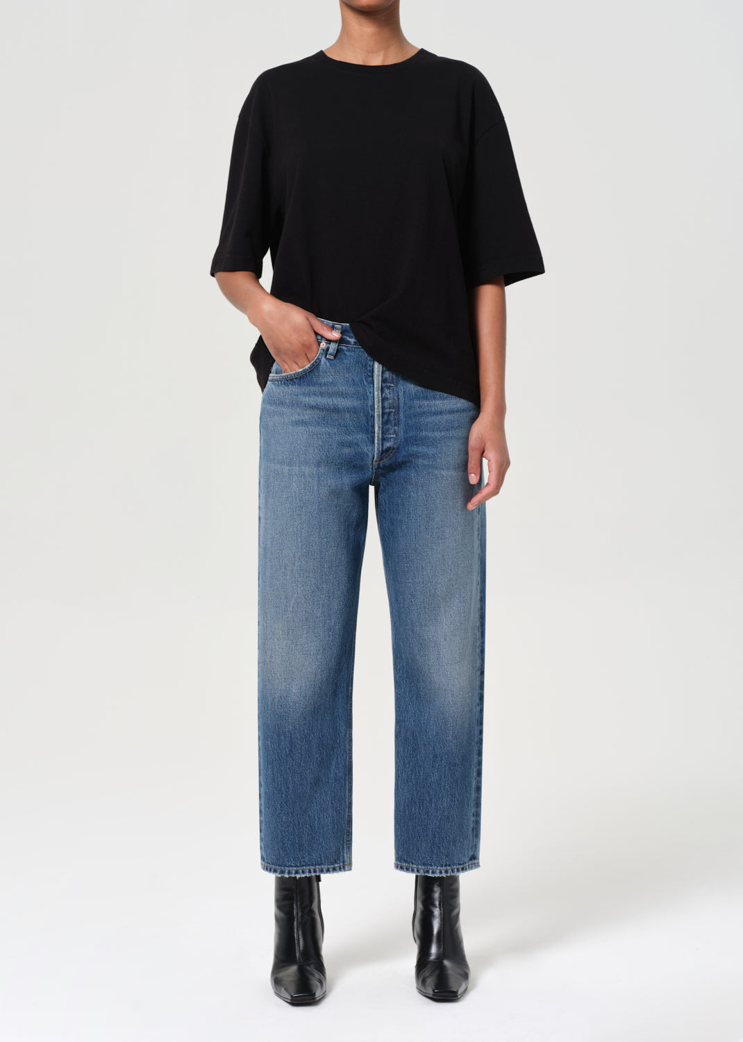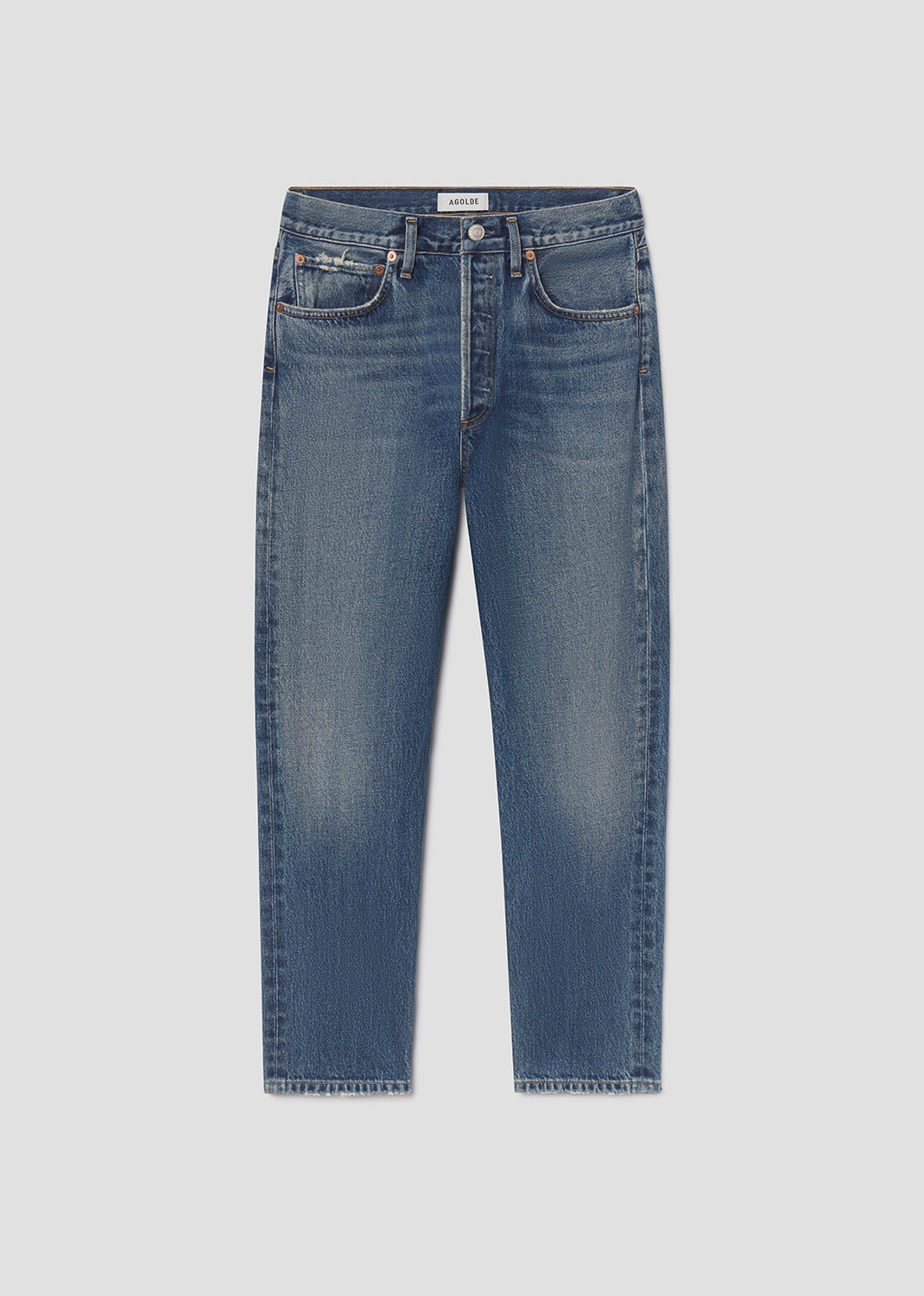 Our best-selling 90’s Jean, now with a cropped inseam. This mid-rise fit sits relaxed at the waist and flows into a loose straight leg. Crafted from rigid, non-stretch 100% regenerative cotton denim, it softens with each wear. The medium vintage indigo wash features subtle fading and whiskering for a timeless look. Pair with a tailored blazer and pointed-toe boots for a polished yet laid-back vibe, or style with a tucked-in tee and sneakers for an effortlessly cool weekend look.