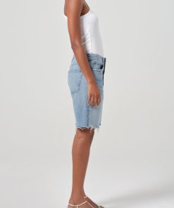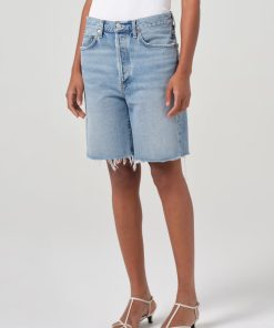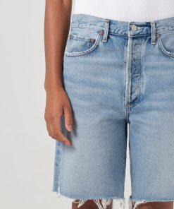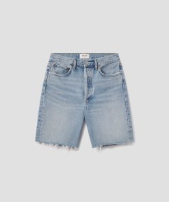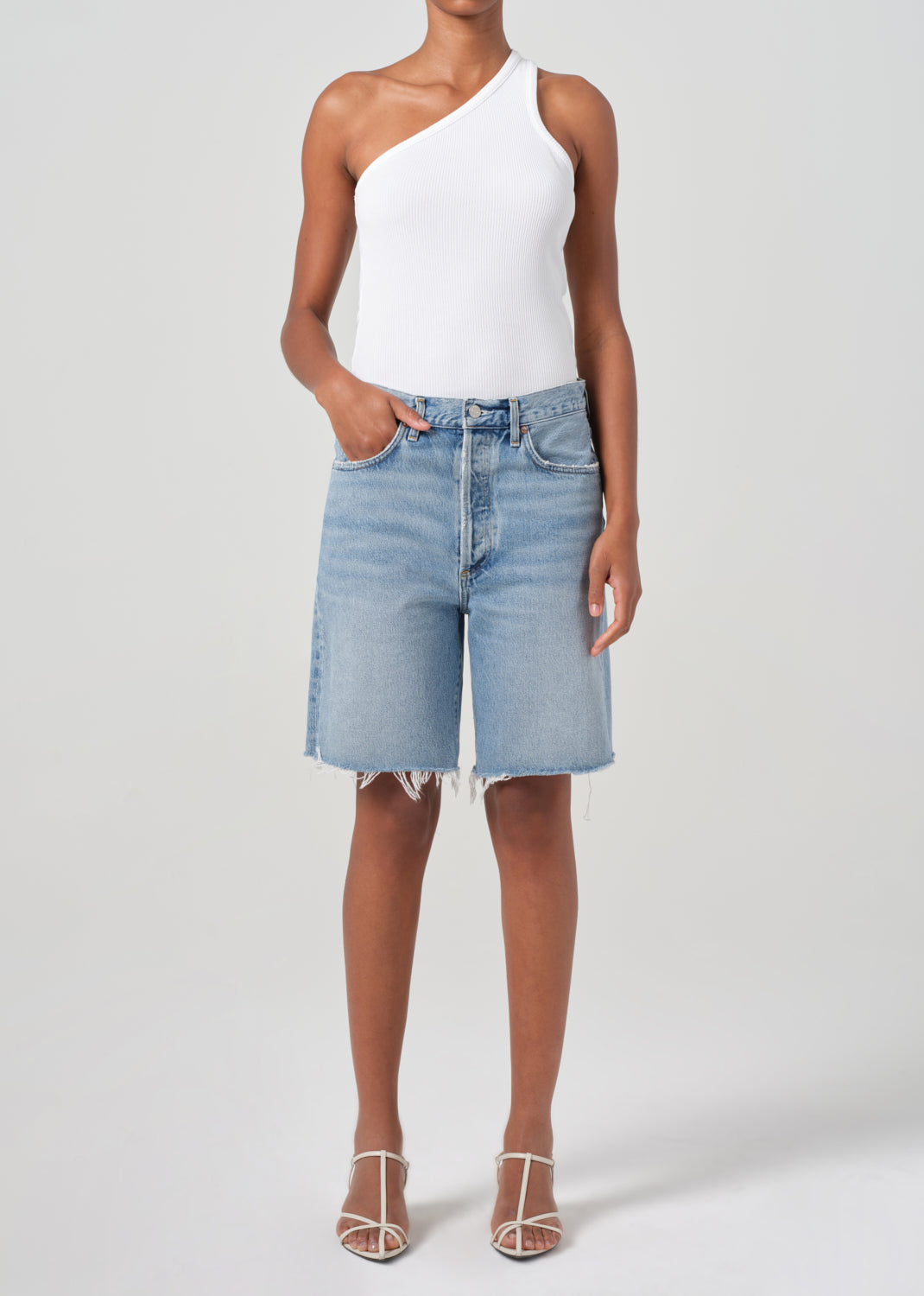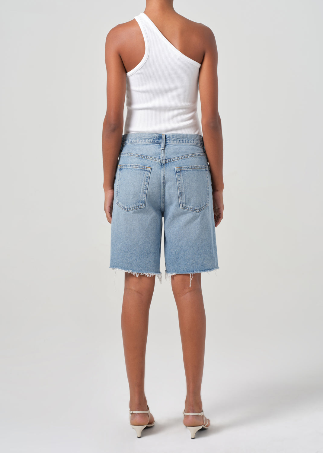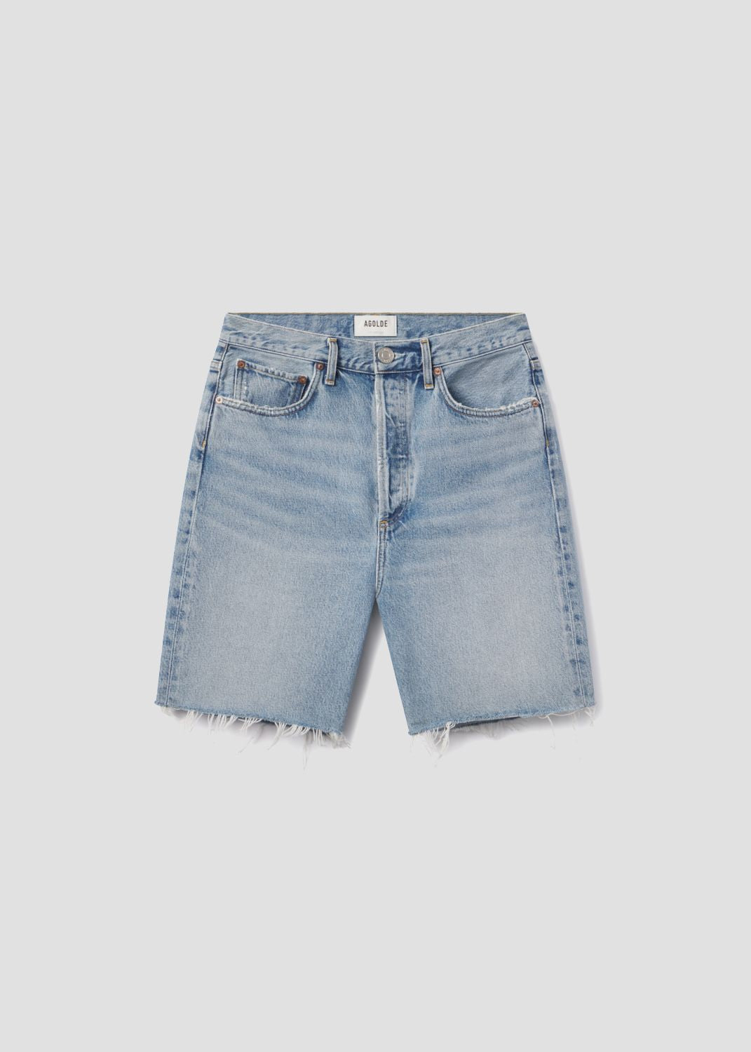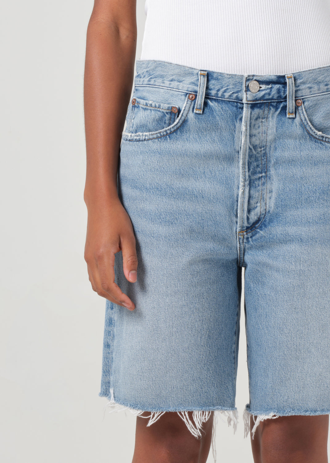 The 90’s Short sits relaxed at the waist with a roomy extended inseam that hits just above the knee, offering a laid-back, effortless fit. Crafted from regenerative cotton and vintage marbled light indigo denim, it features subtle fading, whiskering, and a raw hem for a perfectly worn-in look. Style it with a simple white tank and chunky sandals for a relaxed, casual vibe, or pair it with an oversized button-down shirt and slides for a chic, effortless ensemble that takes you from beach days to brunch with ease.