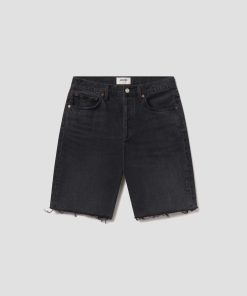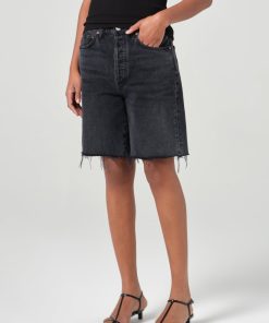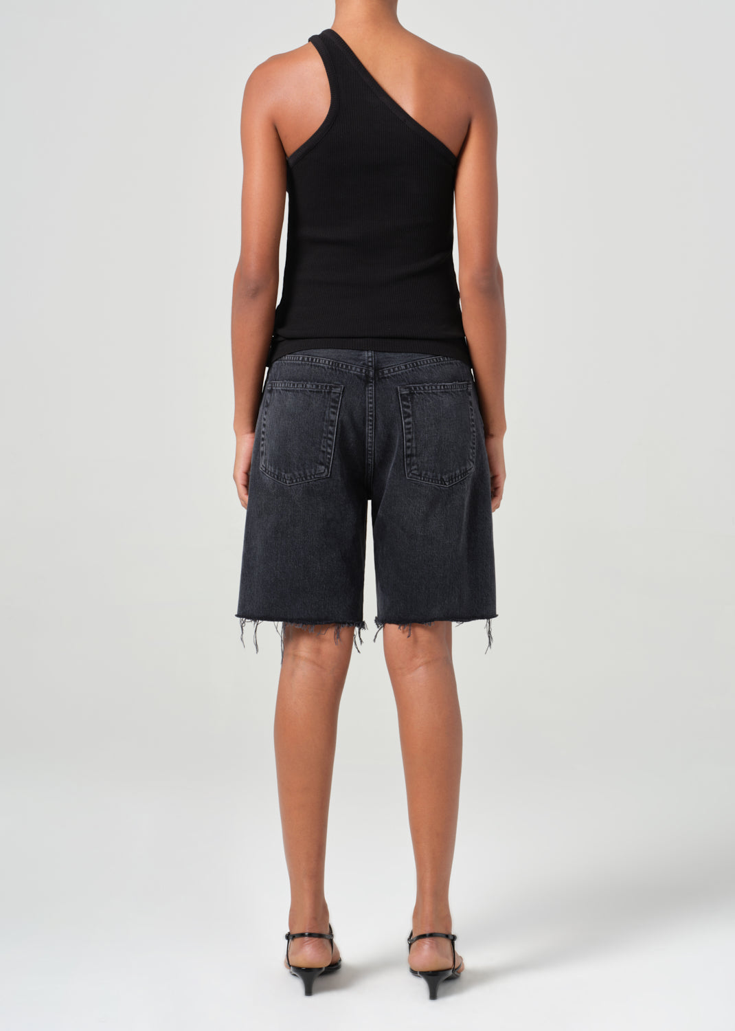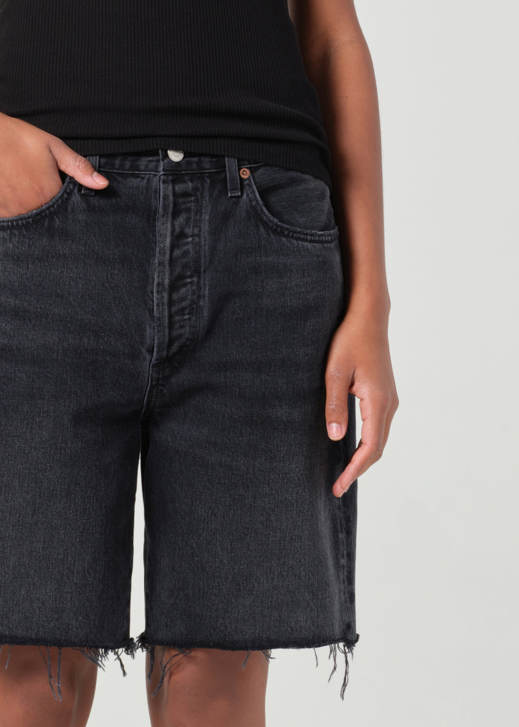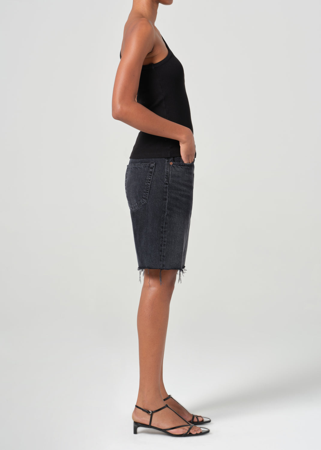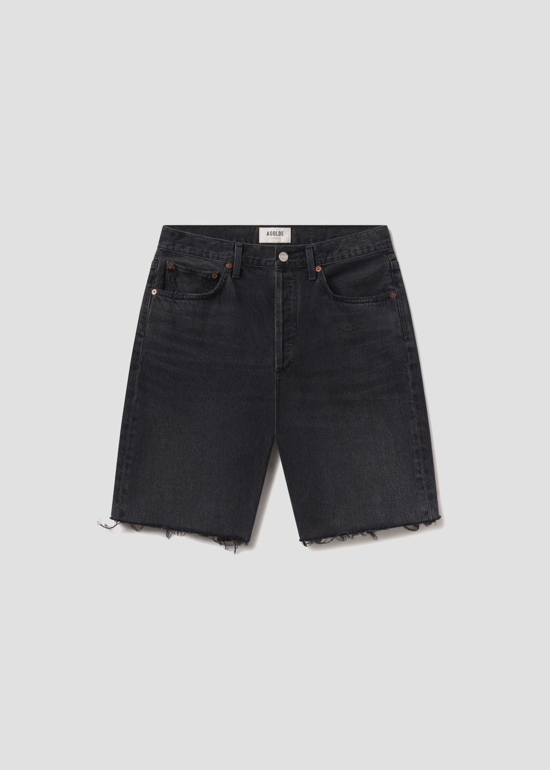 The 90’s Short sits relaxed at the waist with a roomy extended inseam that hits just above the knee, offering a laid-back, effortless fit. Crafted from regenerative cotton in a washed black denim, it features subtle fading, whiskering, and a raw hem for a worn-in, vintage-inspired look. Style it with a simple white tank and chunky sneakers for an easy, cool vibe, or pair it with a relaxed button-down and slides for a laid-back yet elevated look.