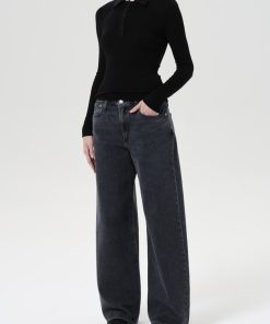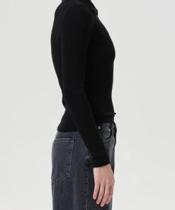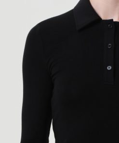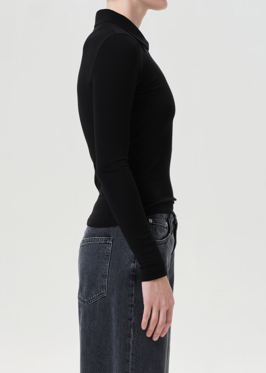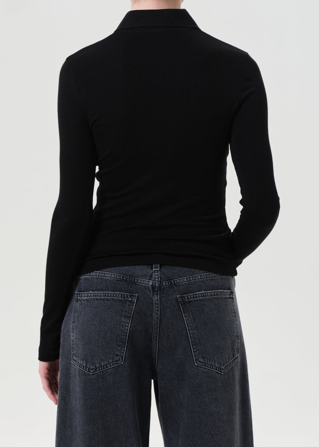 The Amos Polo in Black is a long sleeve henley polo featuring a sharp pointed collar. Made from ultra-soft, lightweight fine needle fabric, it offers a sleek, refined fit. The deep black tone adds a timeless edge, making it versatile enough to pair with high-waisted denim for an elevated look or tuck into tailored pants for a chic, polished vibe.