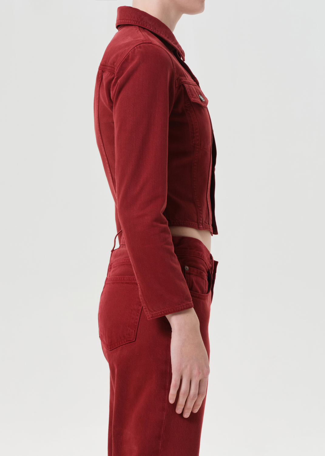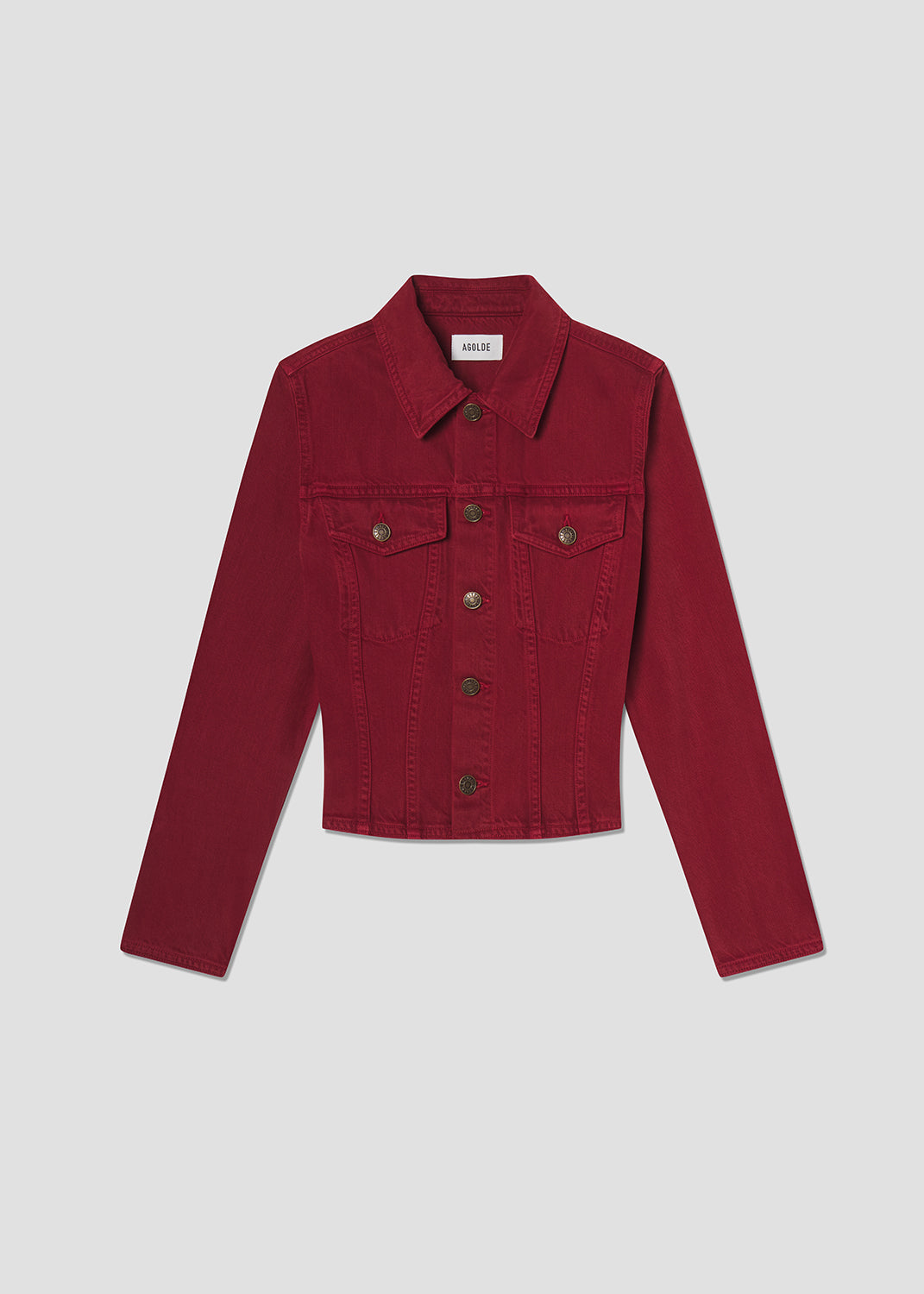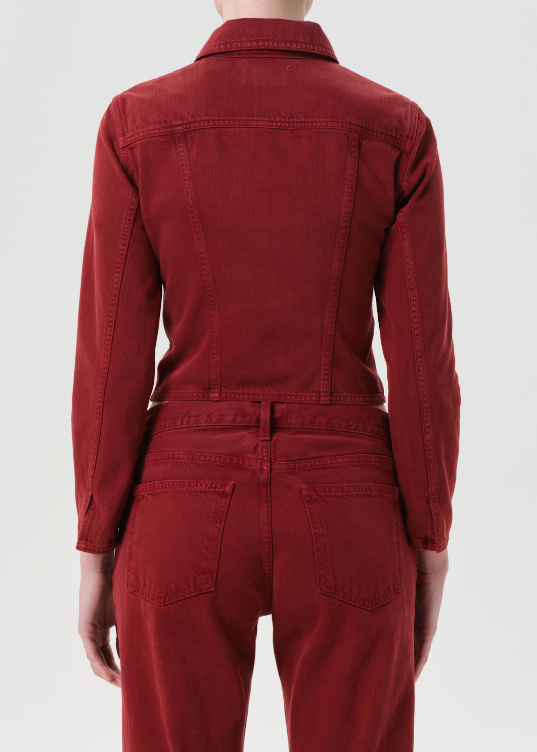 The Contoured Jacket is a fitted denim layer with clean lines and shaping seams that define the waist. Crafted from rigid, non-stretch denim in a deep, saturated brick red, it’s made with a soft cotton blend for structured comfort. Pair with tonal denim or contrast with neutrals for a standout styling moment.