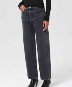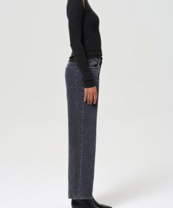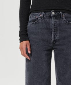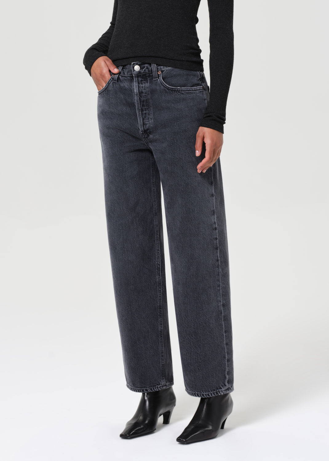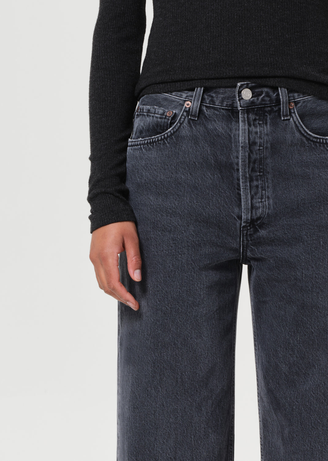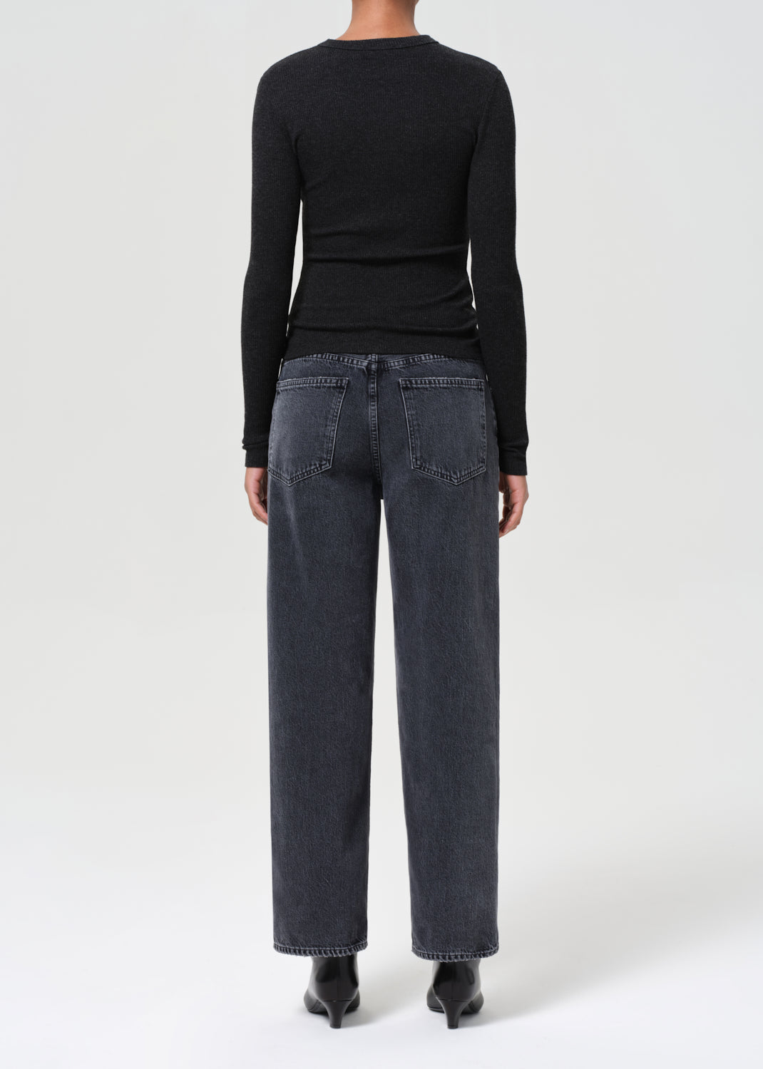 The Henson Jean sits high at the waist with a relaxed, full-length leg that tapers slightly at the ankle. Finished in a medium washed-out black with soft marbling and whiskering, this pair delivers a laid-back, vintage-inspired look. Style with a fitted tank or oversized knit for easy contrast.