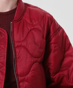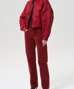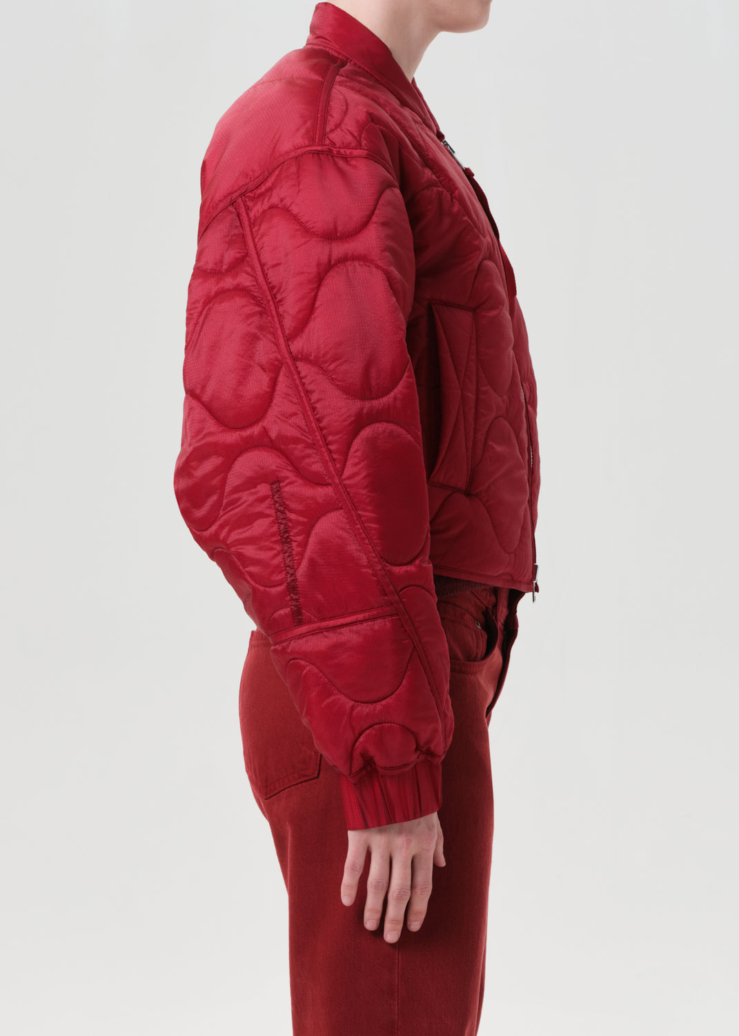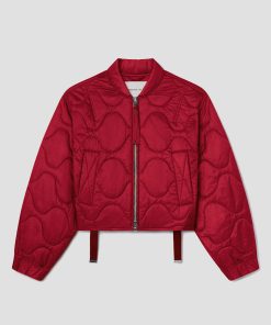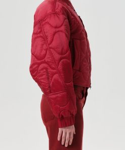 Looks Like: Bright medium red cropped quilted jacket with zipper front closure