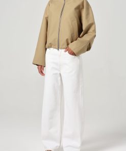 Workwear inspired with a front zipper closure, side slant pockets and button cuffs.