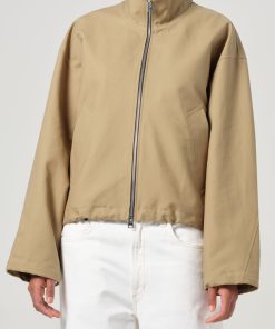 Looks Like: Medium beige zip up jacket with olive undertones and a drawcord bottom