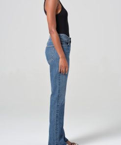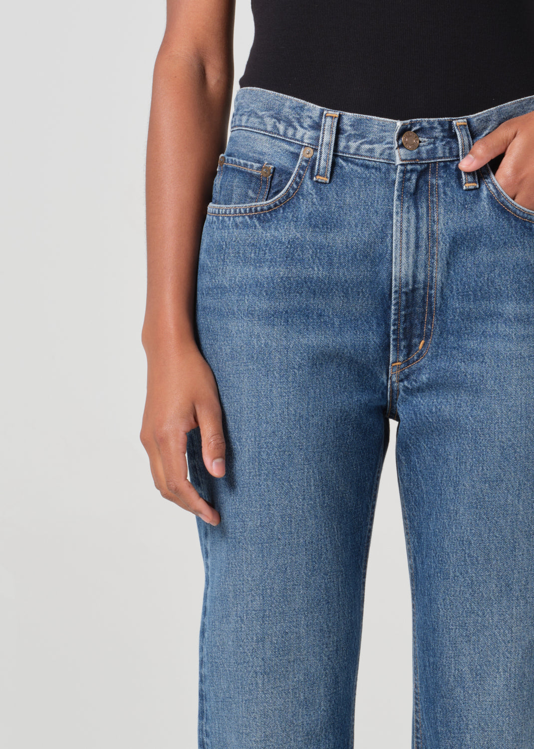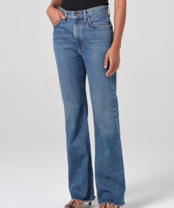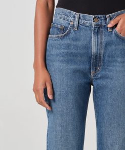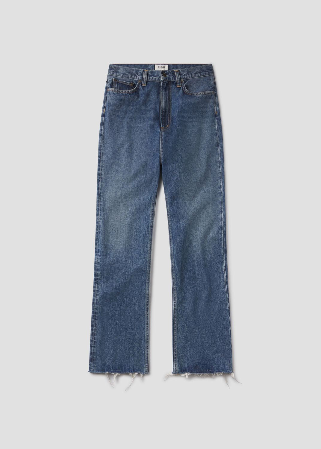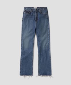The Leena is a high-rise baby flare jean that blends a modern and vintage-inspired fit. Crafted from regenerative cotton, it features a flattering cut-off hem and traditional five-pocket detailing. Made in vintage medium to dark indigo denim, with fading, whiskering, and a raw cut hem, this jean has a beautifully draped fabric that adds effortless style to any look. Pair with a simple fitted top and sandals for an easy, casual day look or elevate with a tucked-in blouse and heeled boots for a more polished ensemble.