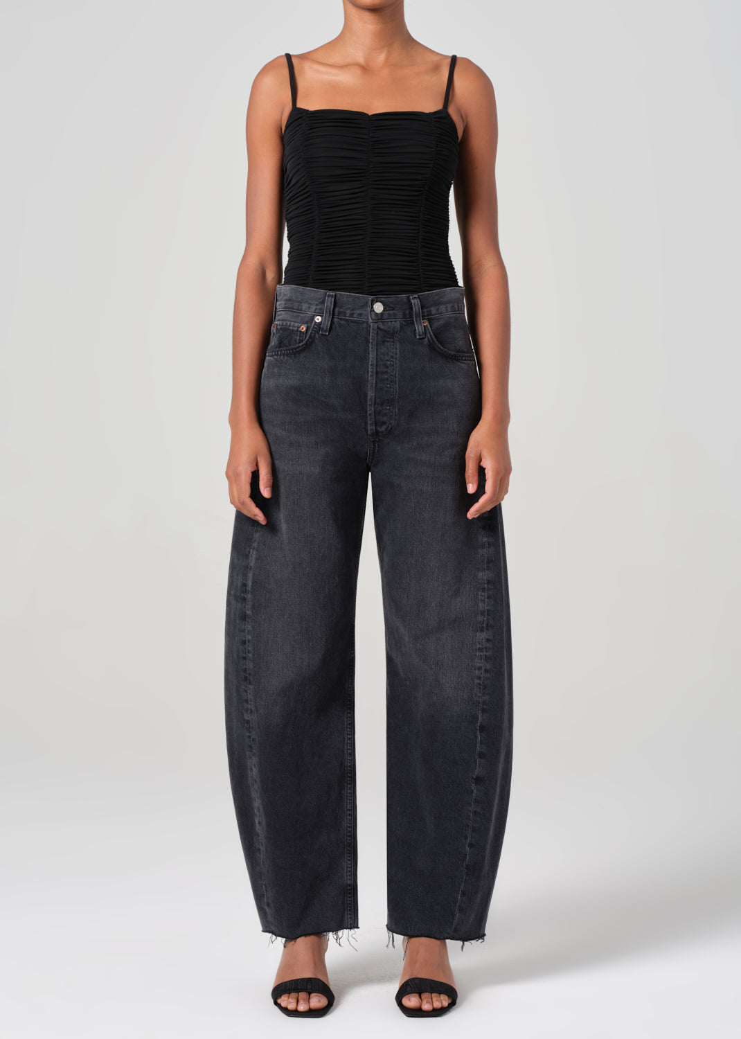 Structured to perfection. The Luna is designed with a waist-accentuating high-rise and a full-length relaxed leg. The pieced insert detailing at the outseam creates a bowed leg silhouette, ideal for taking your everyday denim to the next level.