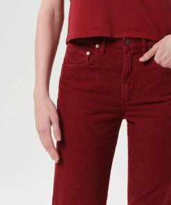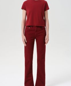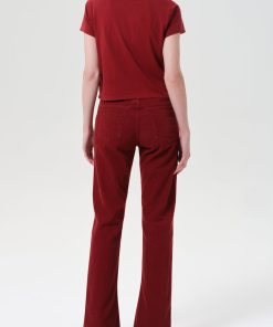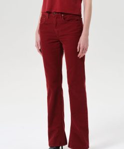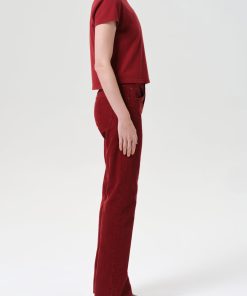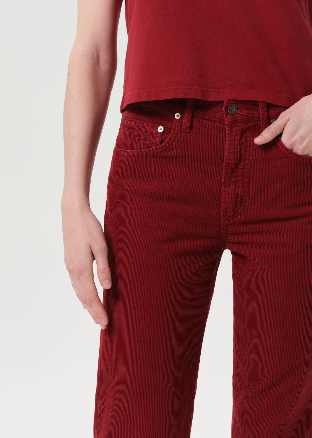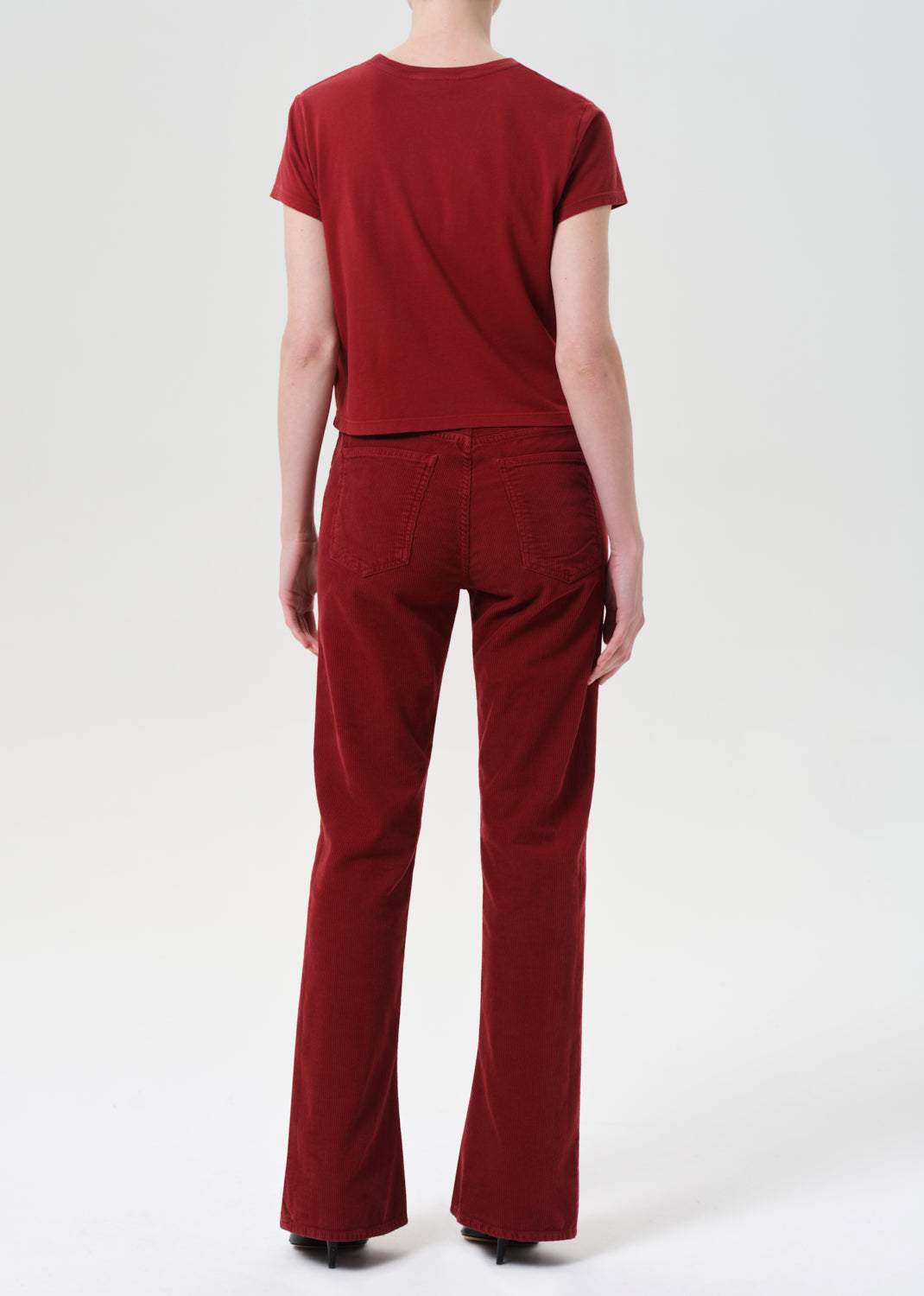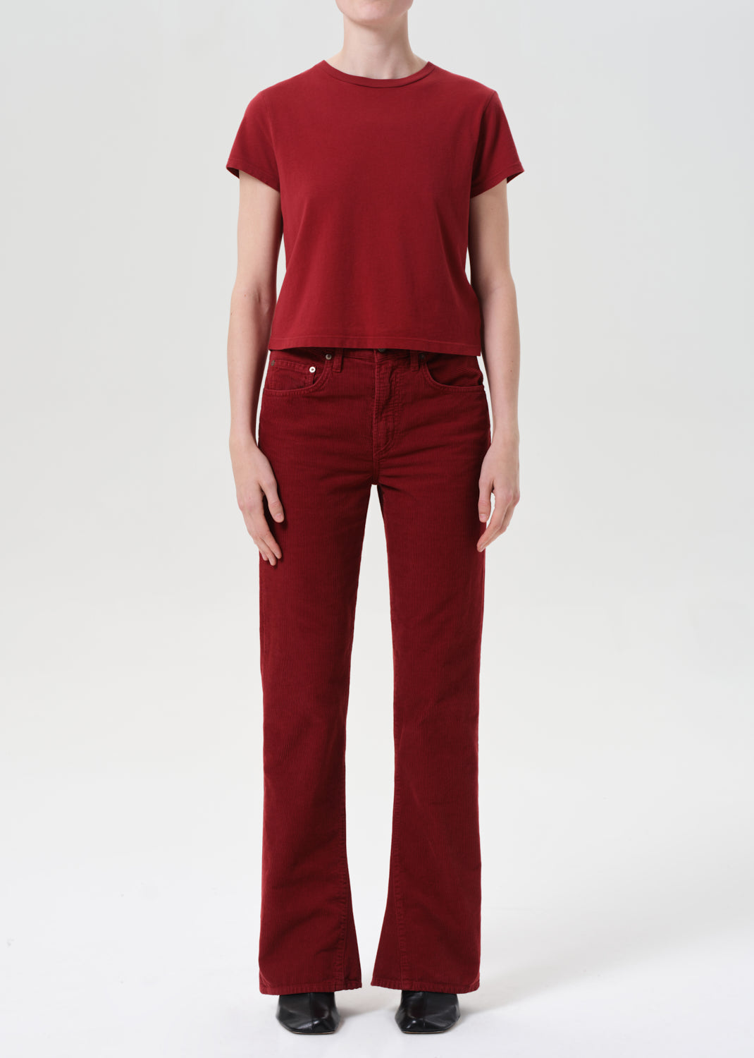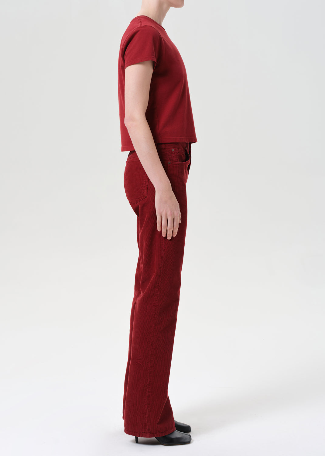 A vintage-inspired silhouette reimagined in plush, velvety corduroy. The Kick Boot sits at the mid waist with a slim fit through the thigh before subtly flaring at the ankle—an effortless nod to retro tailoring. Crafted from a rich, dark red cotton cord with a super soft hand feel. Pair with a sleek turtleneck or go monochromatic with a tonal tee.