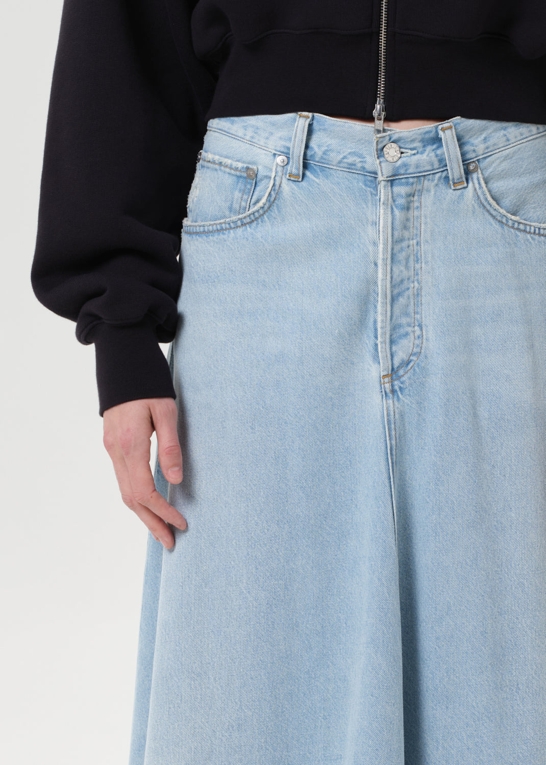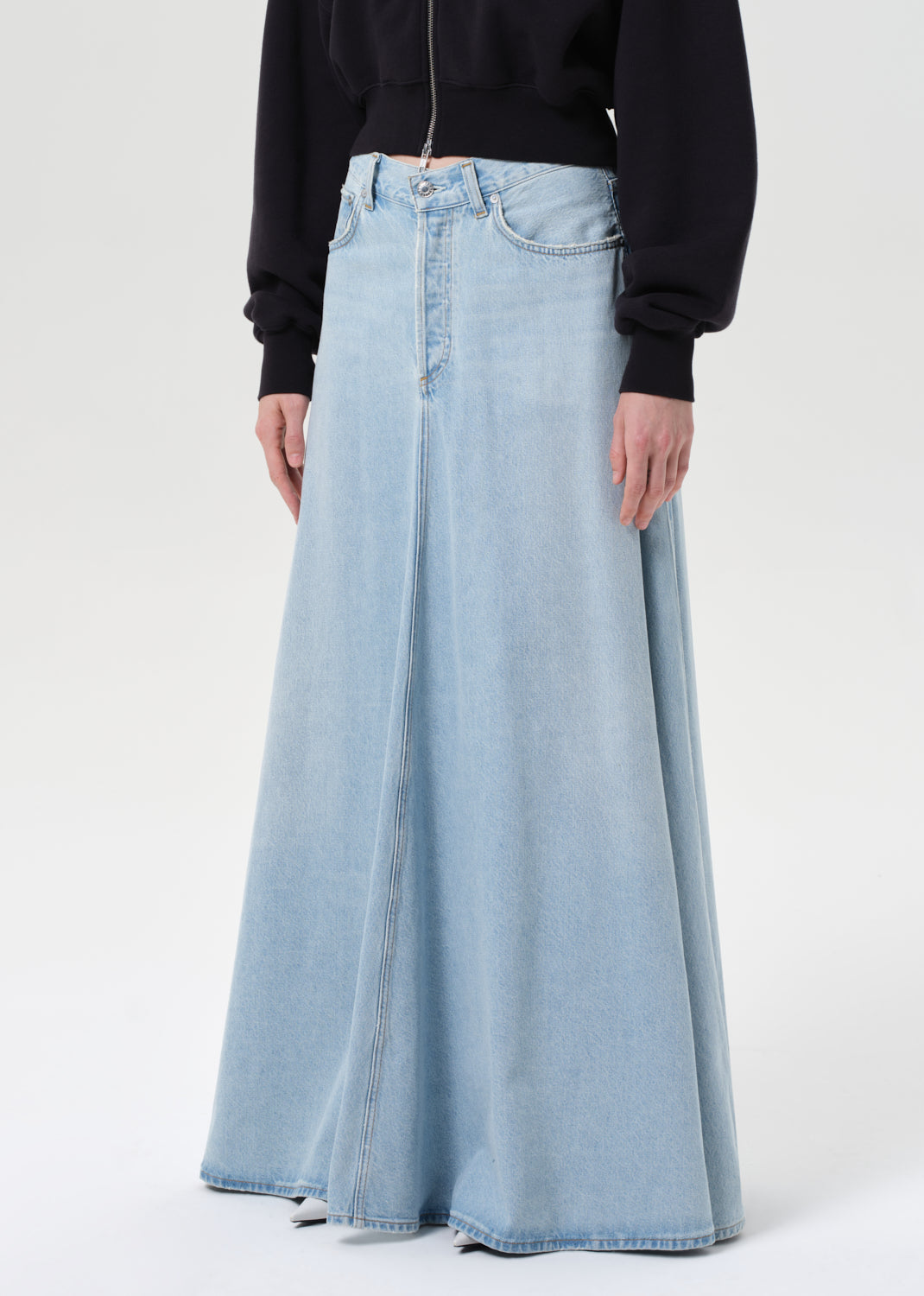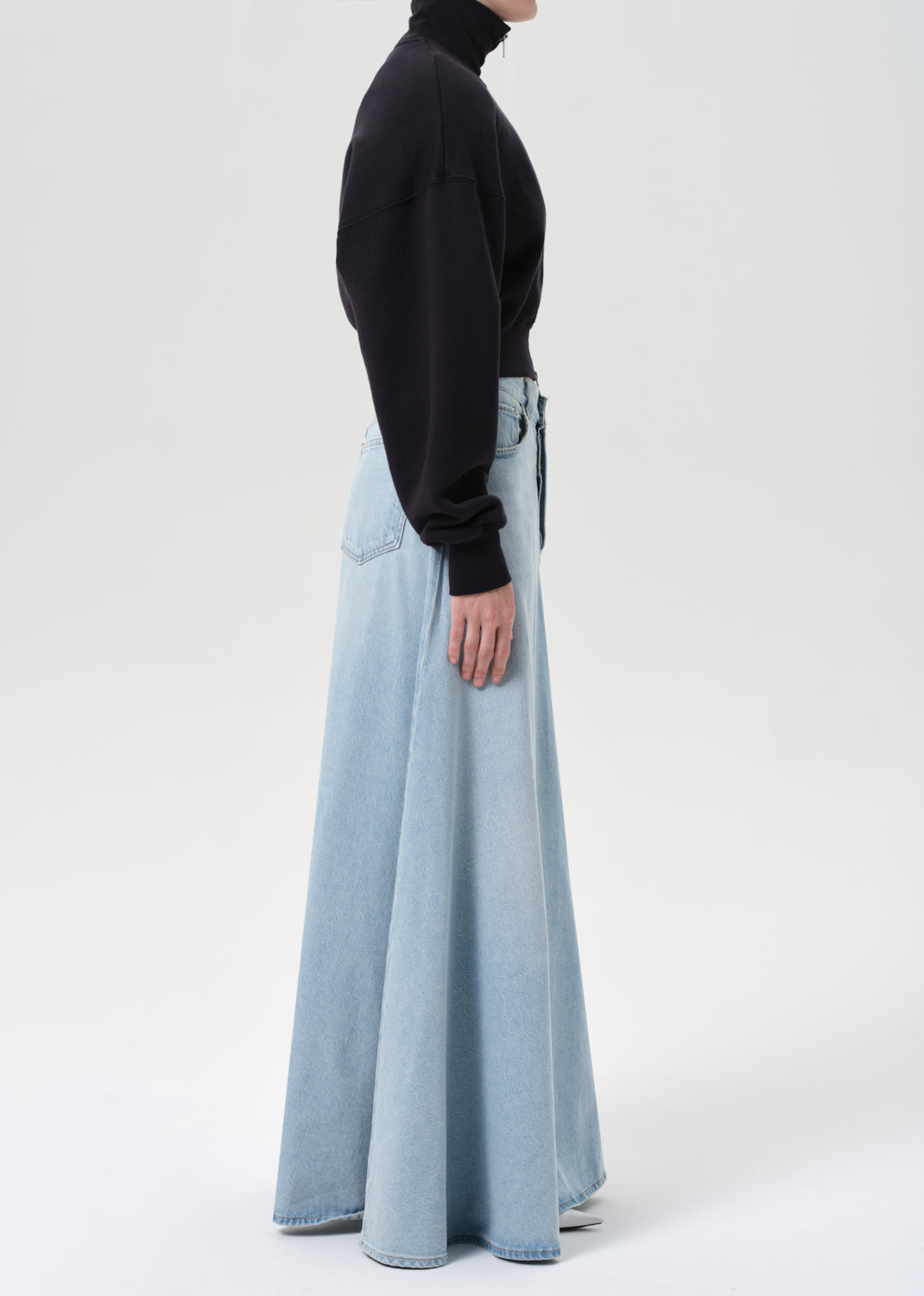 The Odin Skirt is a full-length, exaggerated denim silhouette crafted in a light worn-in indigo wash. Designed in soft, weightless non-stretch denim, it offers effortless movement and a vintage-inspired look. Finished with a raw hem and classic five-pocket styling—pair with everything from fitted tanks to oversized knits.