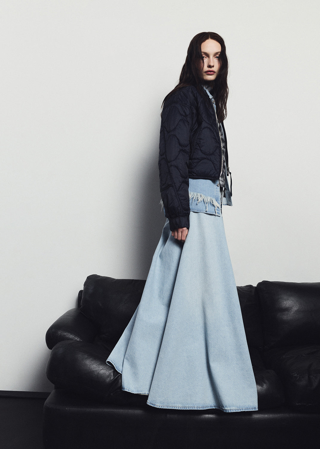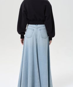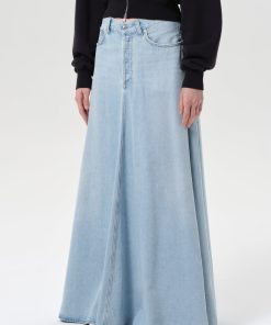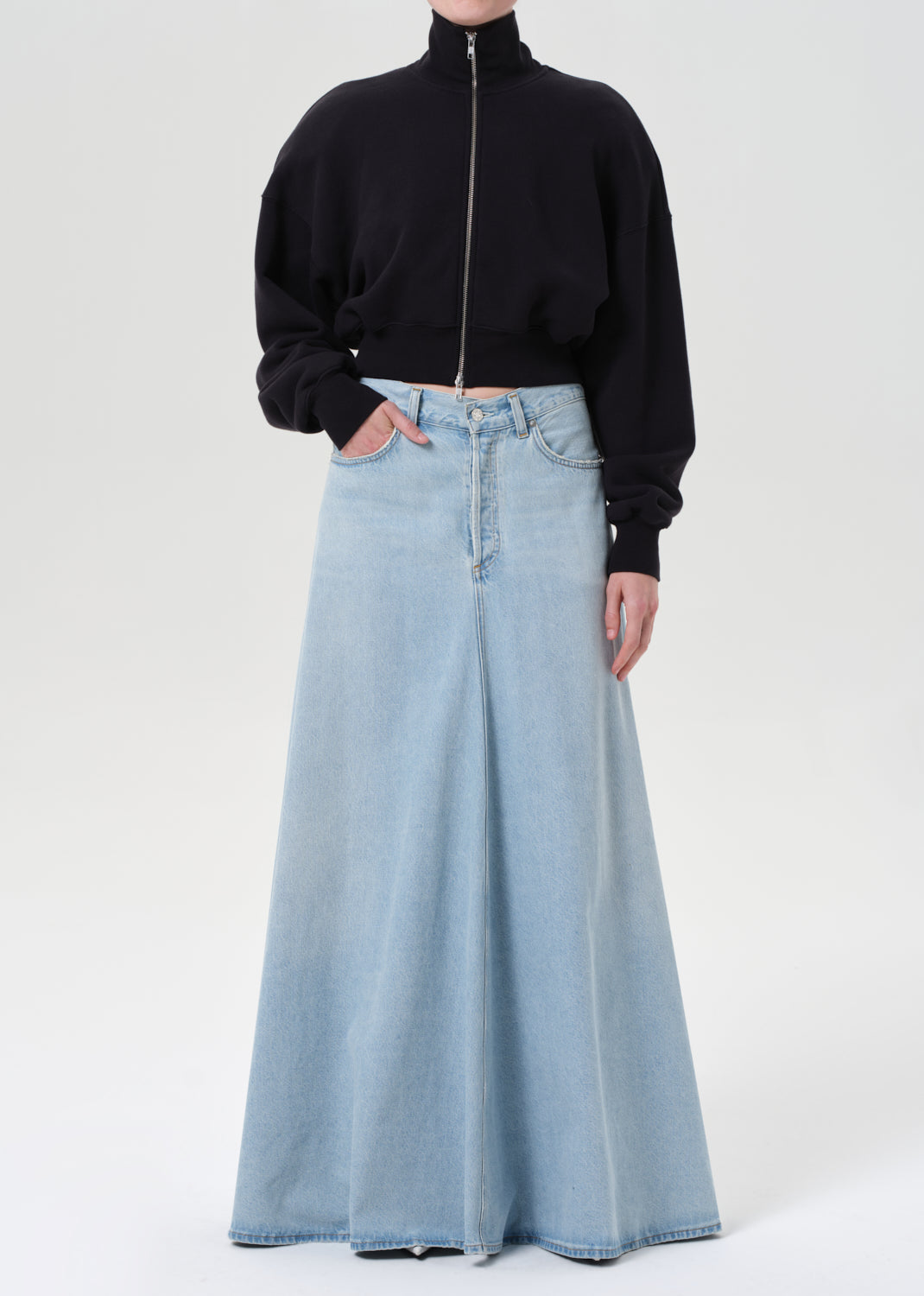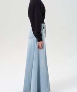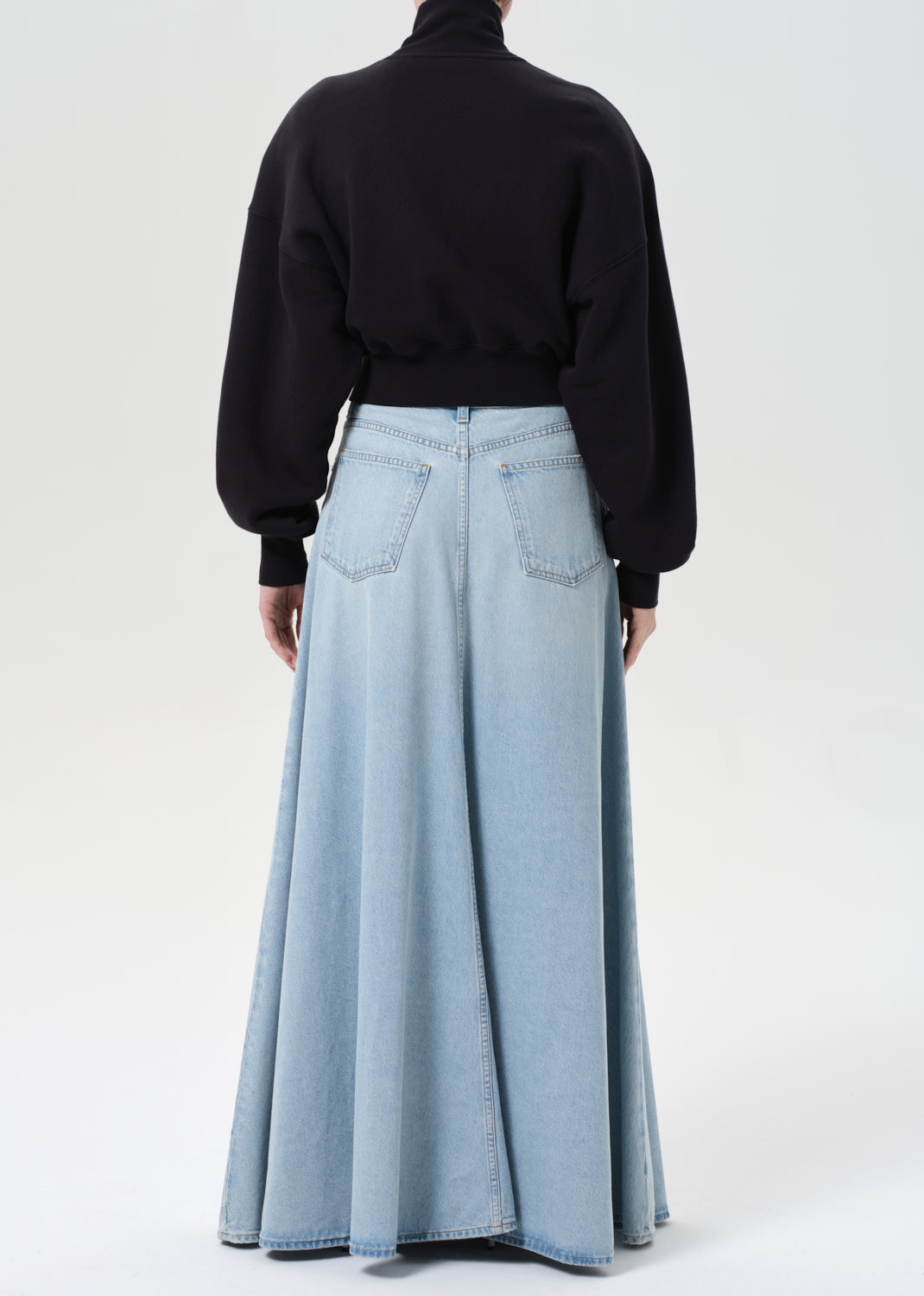 The Odin Skirt is a full-length, exaggerated denim silhouette crafted in a light worn-in indigo wash. Designed in soft, weightless non-stretch denim, it offers effortless movement and a vintage-inspired look. Finished with a raw hem and classic five-pocket styling—pair with everything from fitted tanks to oversized knits.