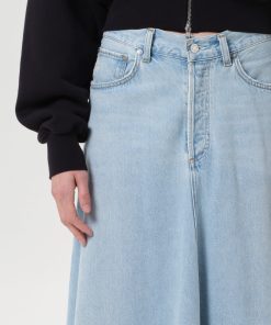 Looks Like: Light worn in indigo full length exaggerated denim skirt