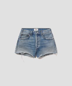 Looks Like: Vintage medium indigo denim short with a cut hem