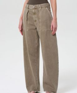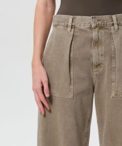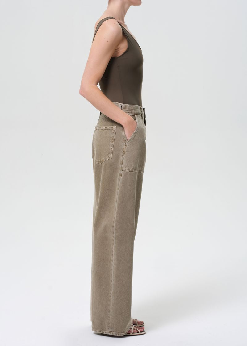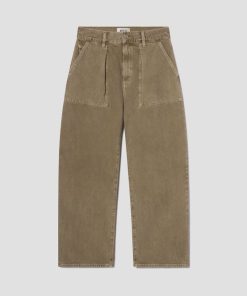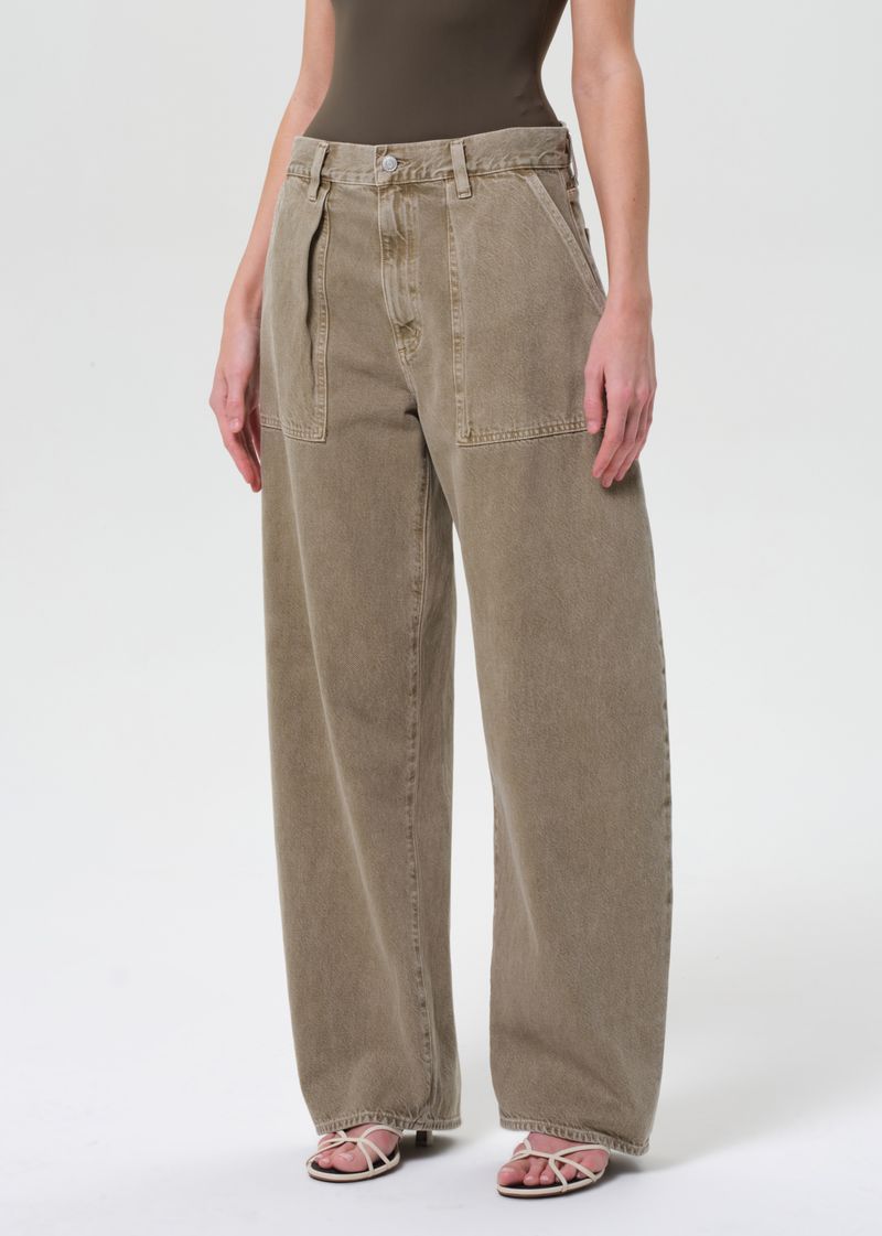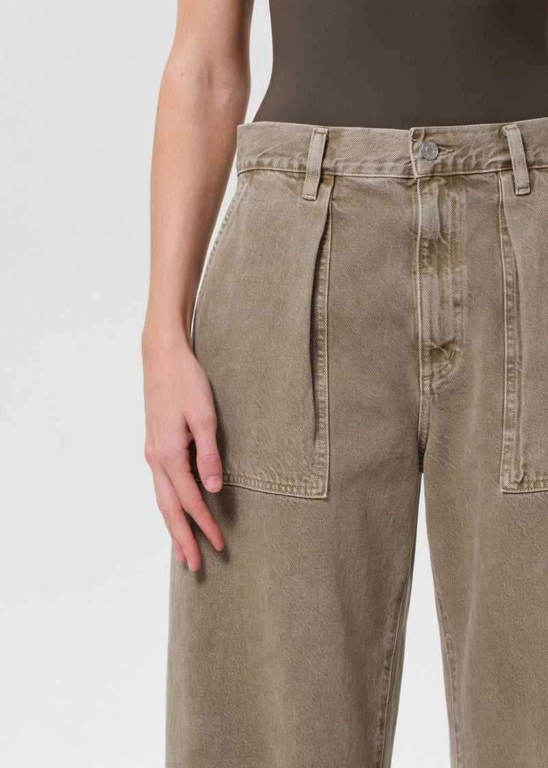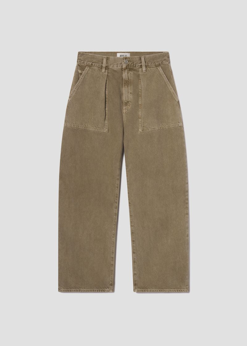 Looks Like: Medium cactus green denim with marbling and pleated utility pockets
