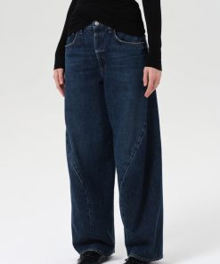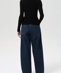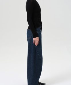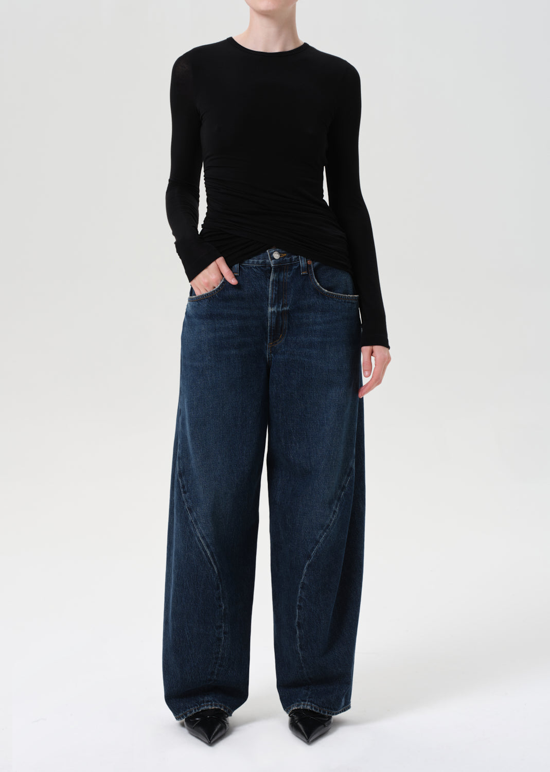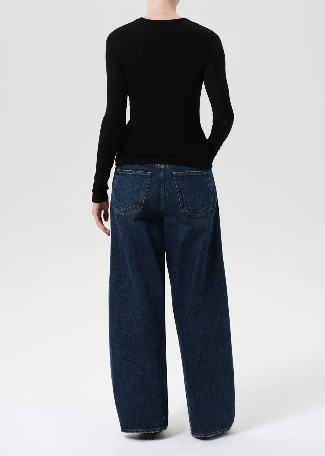 The Twist Jean is cut with a relaxed leg and defined by its offbeat twisted outseam, adding dimension to the classic baggy fit. This version is crafted from dark-tinted, weightless indigo denim that’s been washed for softness and finished with subtle fading and marbling.