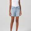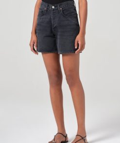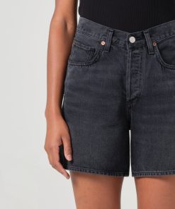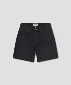 Looks Like: Washed out black denim short with clean hem and a V shaped front rise