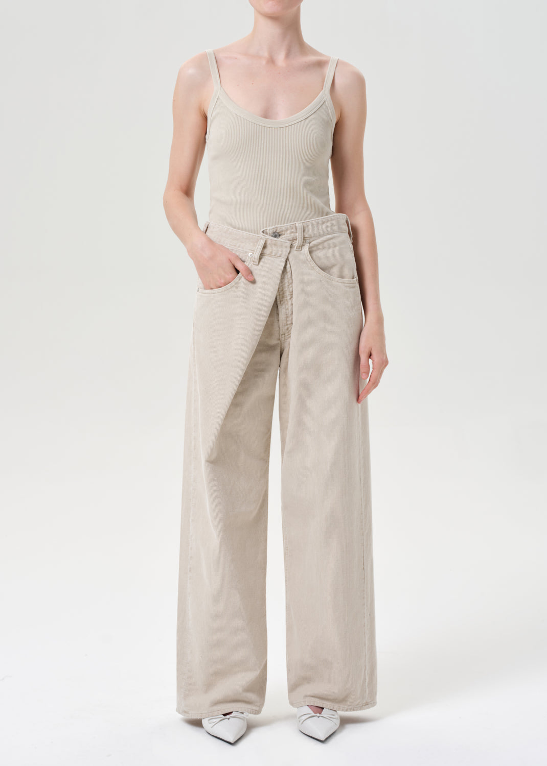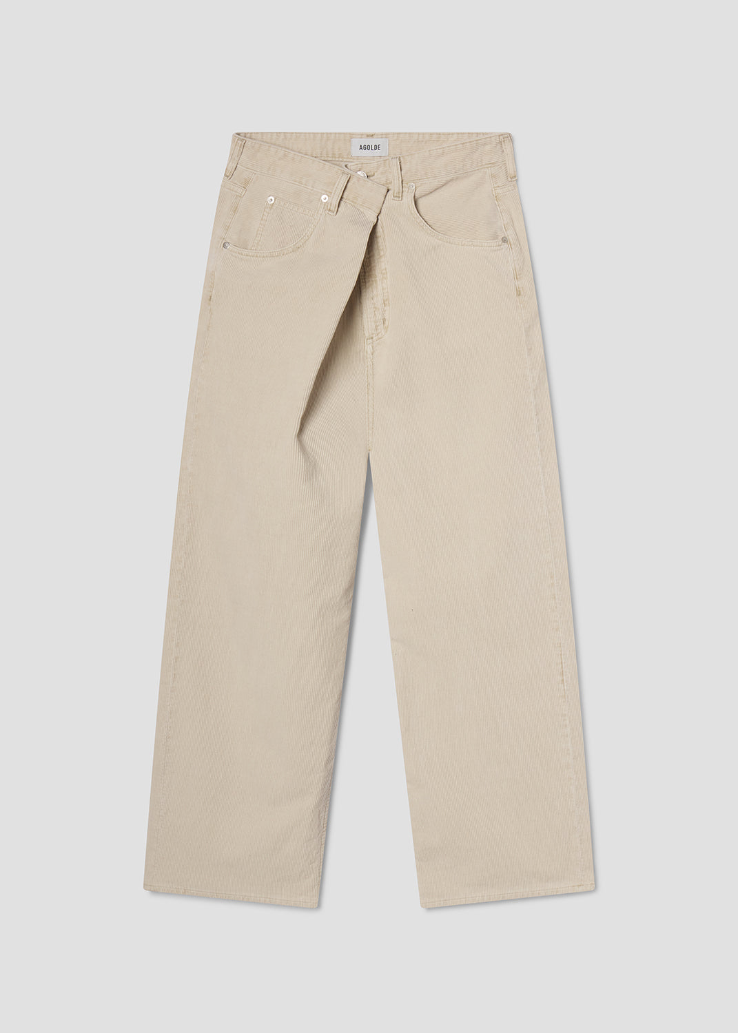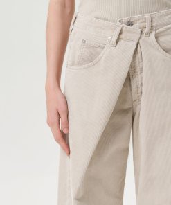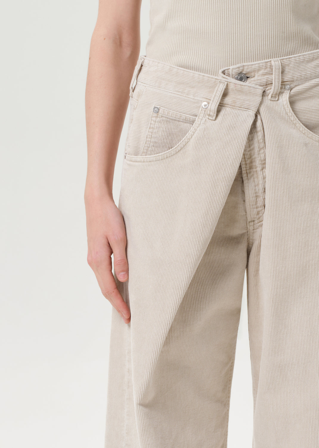 Looks Like: Light beige corduroy pant with fold detailing at the waistband