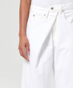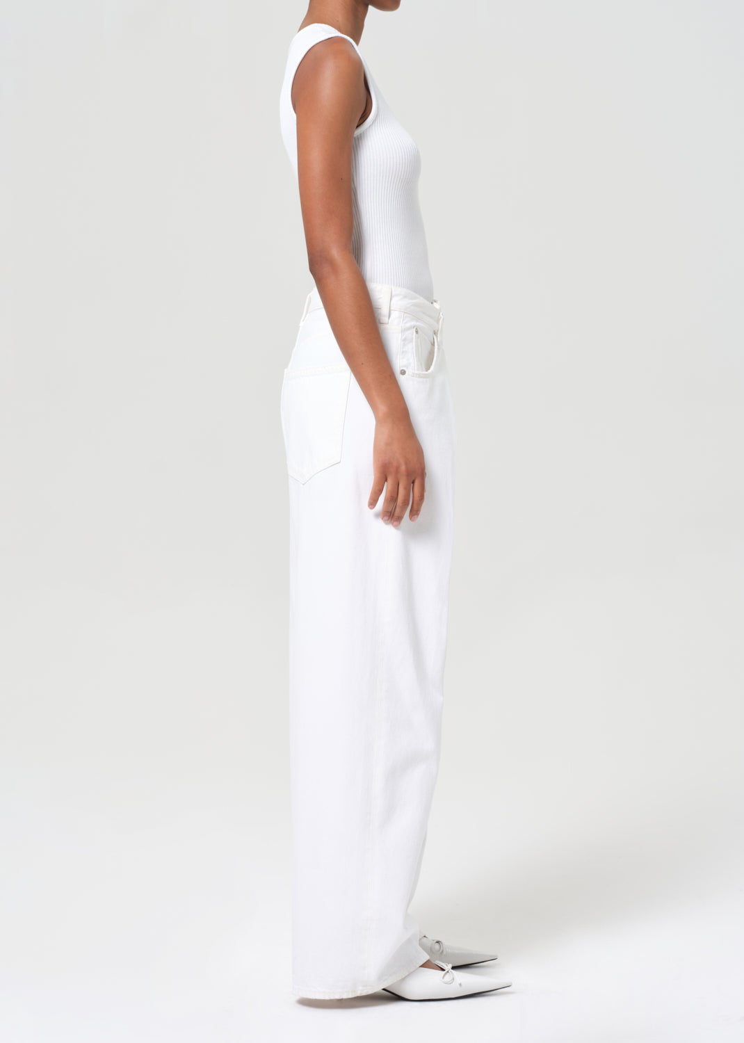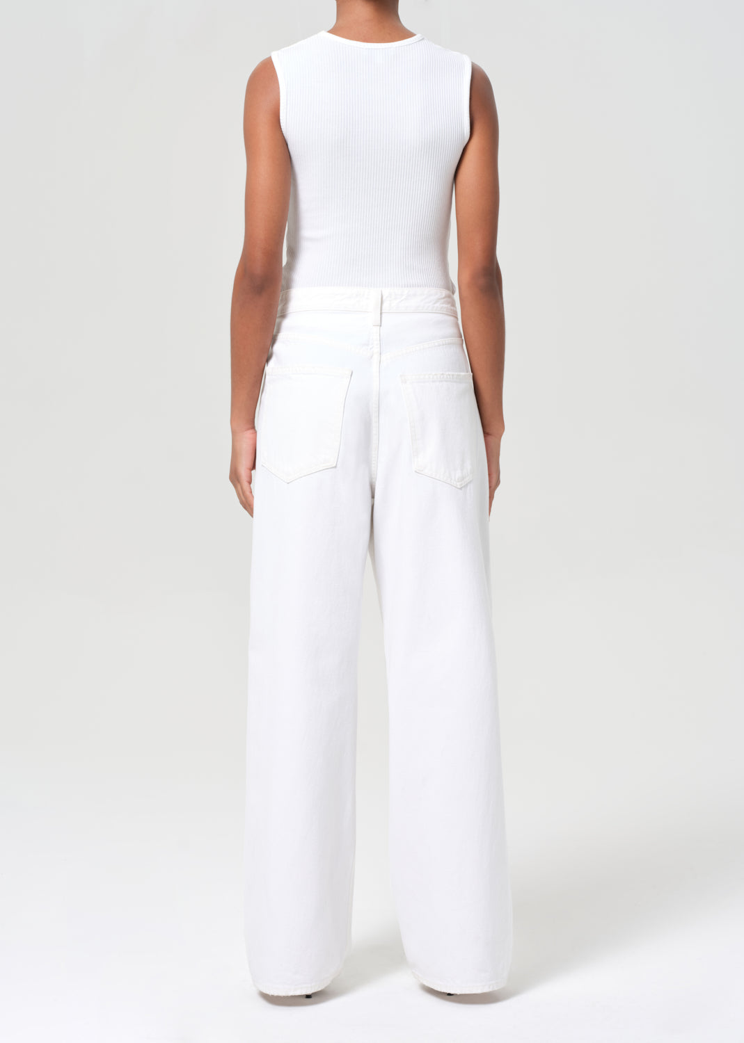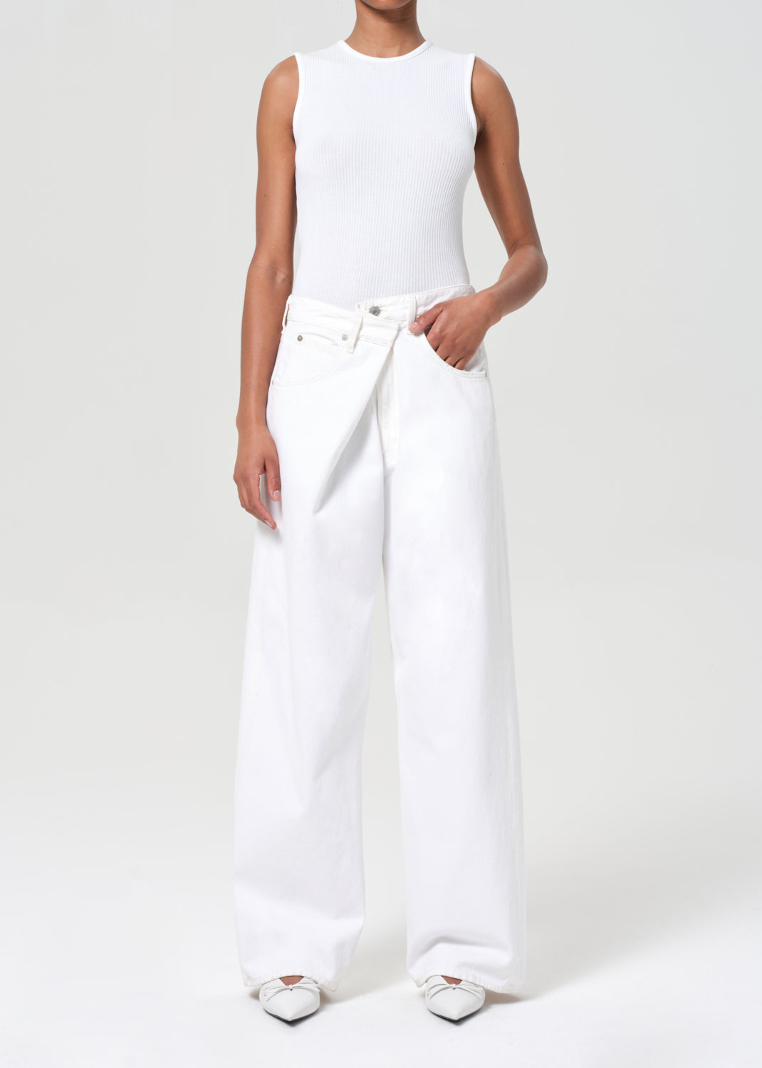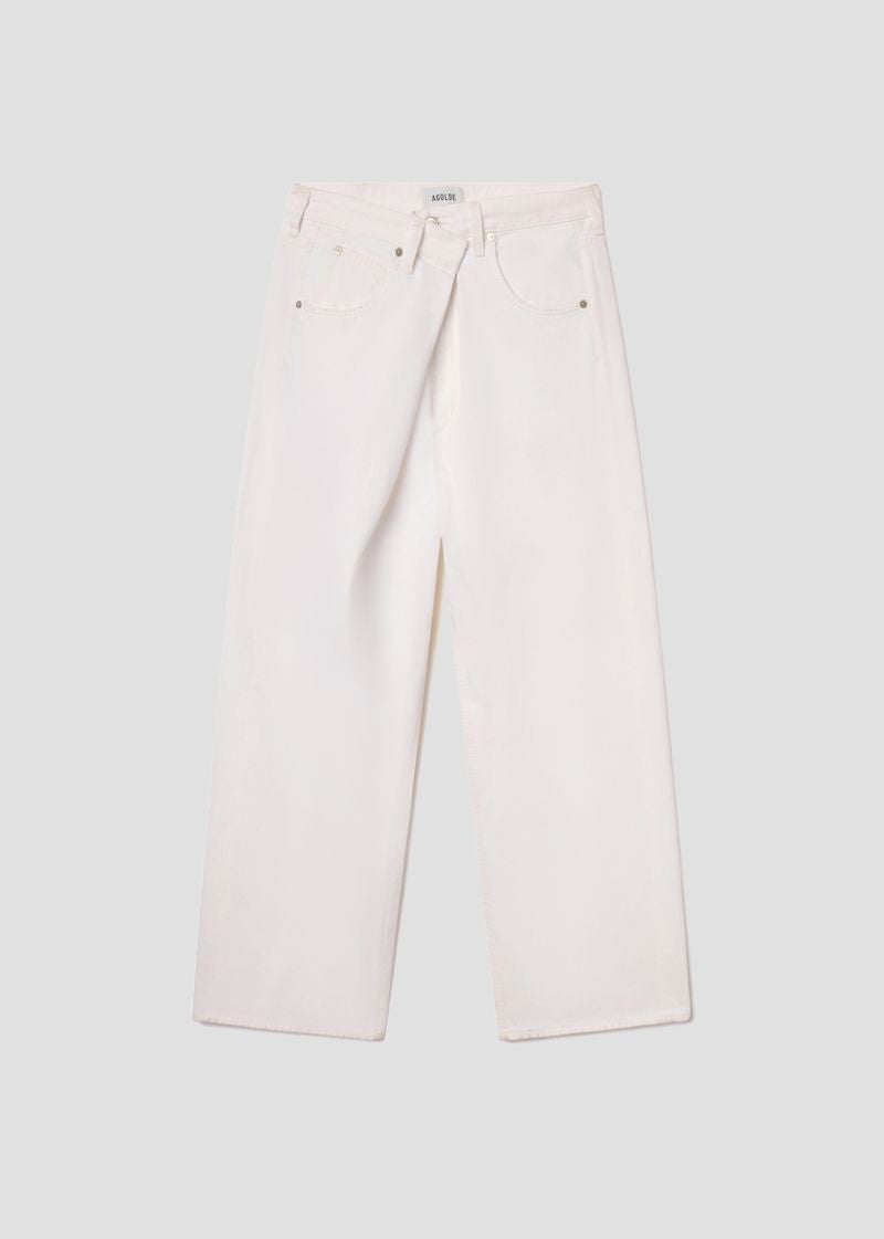 The Vana Jean Fold Jean in white denim offers a fresh, clean look with a bold silhouette and distinctive “fold” closure. Made from regenerative cotton, they’re stylish and sustainable, promoting soil health and carbon sequestration. The low-slung fit and roomy, full-length leg create an effortlessly oversized vibe. For summer, pair with a simple graphic tee and sneakers, or style with a breezy button-up and slides for a relaxed, sunny-day outfit
